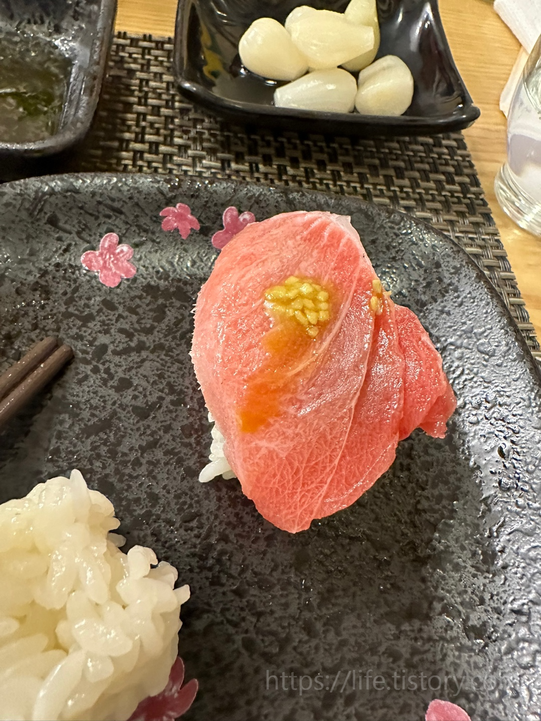 초밥처럼 먹으라고 밥도 같이 나오는데 정말 참치가 살살 녹는다.
