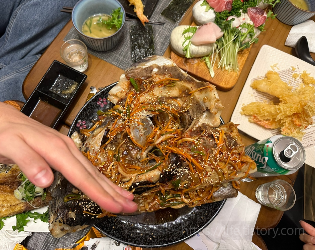 그날 나온 참치머리찜은 첫 날 나온 머리보다 2배는 커보였다. 남편손이 높이 있어서 그런데 두 손바닥으로도 다 가려질 사이즈가 아니었다. 정말 배불러서 많이 못먹었던게 아쉽다.