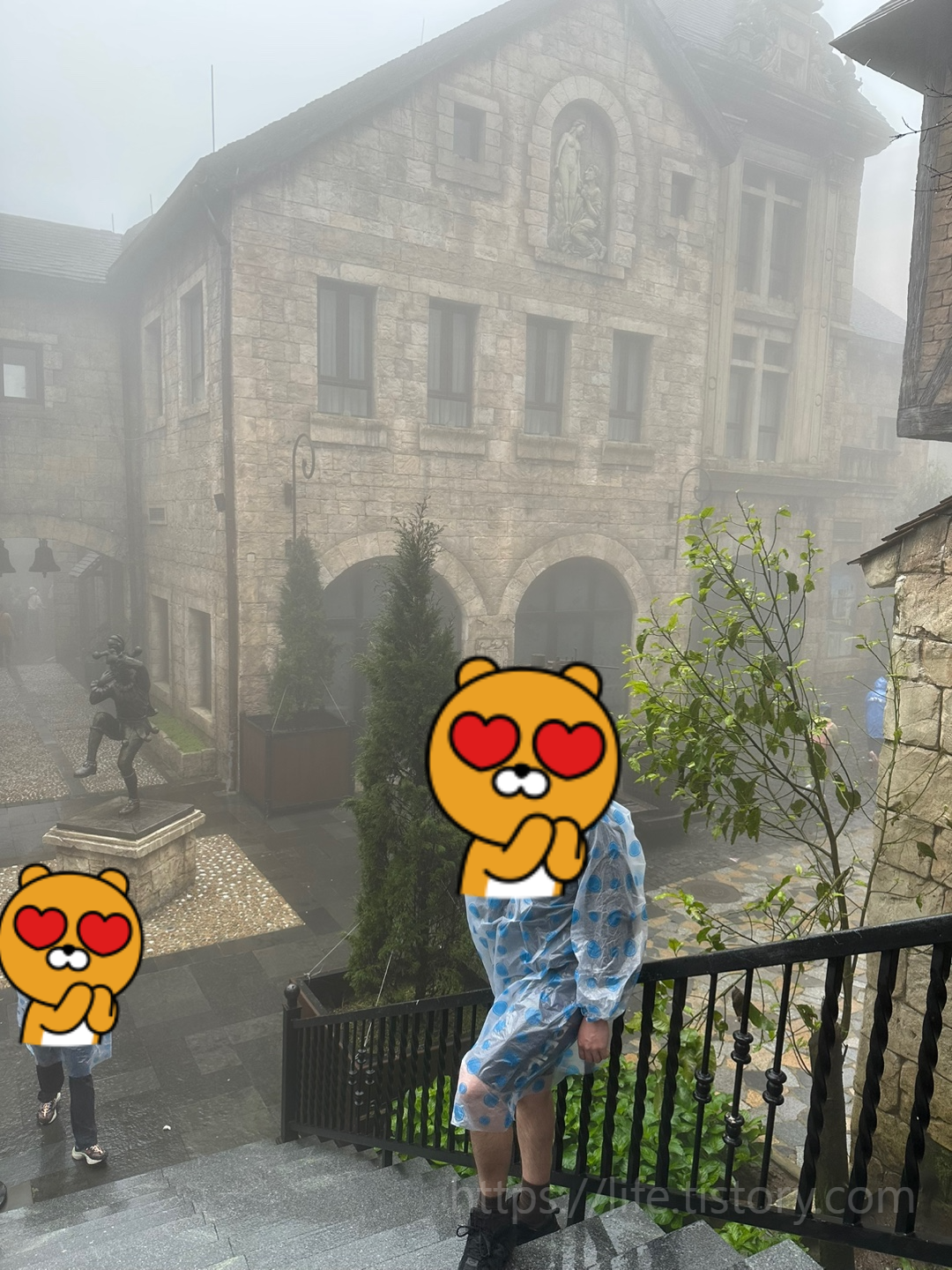 추위를 피하러 들어간 카페, 비가 내려서 다들 우비를 입고 돌아다녔다.