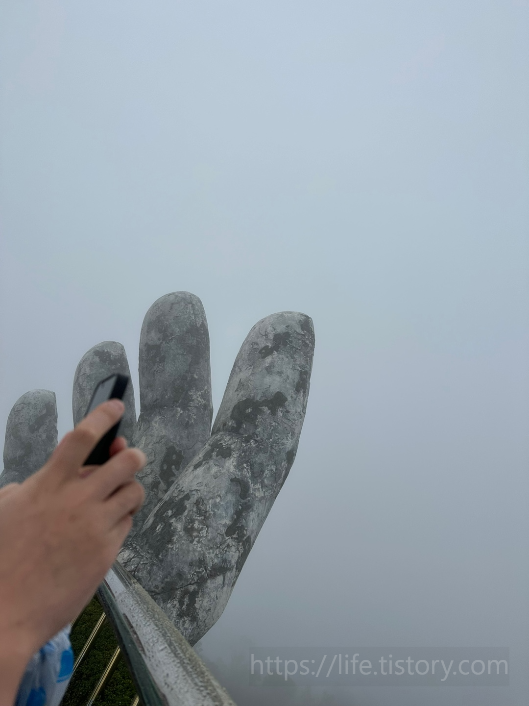 손이 정말 정말 크고 다리 끝에서 끝까지 거리가 꽤 된다. 비바람이 몰아쳐서 첫번째 손만 보고 건물안으로 들어가서 팀을 기다렸다. 관광객들이 많아서 우리 팀 다 나오고 바로 케이블 타고 올라갔다.
