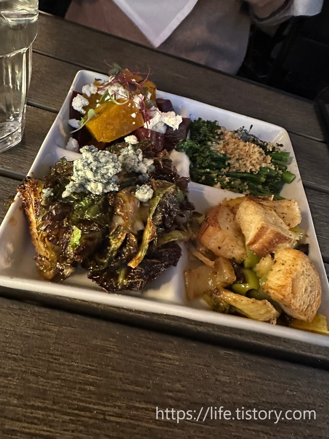 The vegetable plate we ordered had a selection of four different types of seasonal vegetables and preparations. It was surprising how delicious the vegetables were, despite being a simple vegetable plate. We tried each one, and the flavors were all excellent.