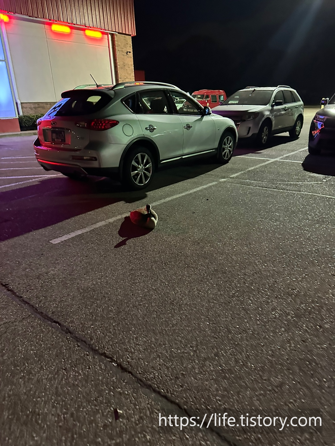 한 자리가 비어있어서 차를 데려고 봤더니 거위가 앉아있었다.