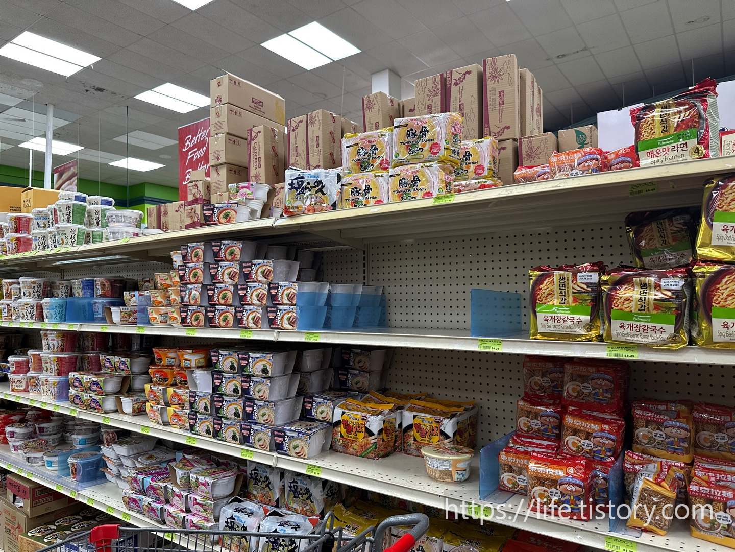 한국 라면과 과자 코너, 가격은 한국에 비한다면 비싼 편이지만 가끔 한국제품이 당길 때 가기 좋은 곳이다.