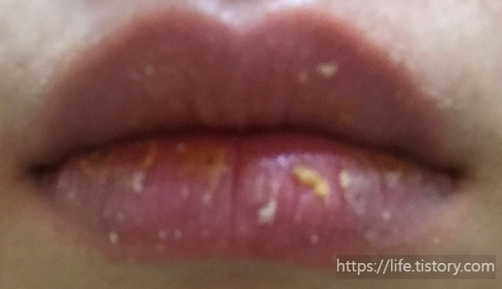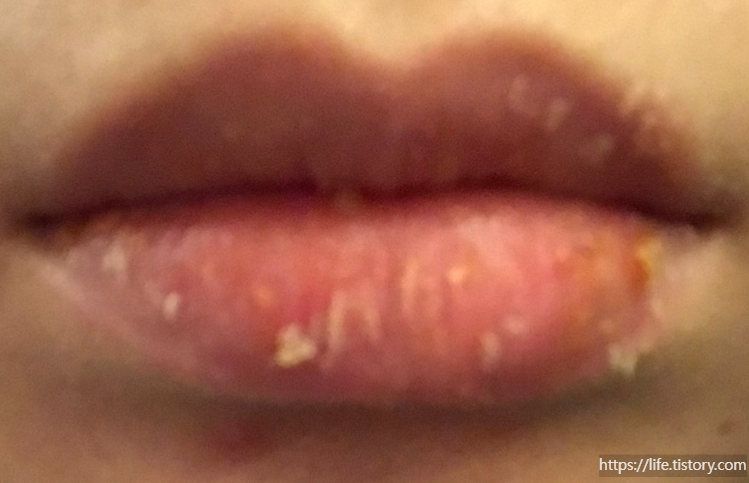 수포가 터져서 진물이 나서 입술 전체에 굳어있었다. 이때는 처음 겪는 일에 이게 대체 뭐지 하고 상황파악이 안 됐었다.