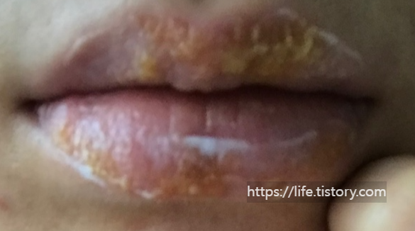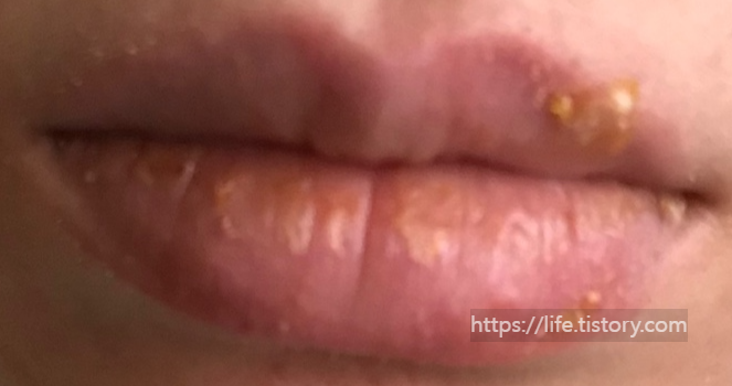 입술에 저렇게 진물이 나고 수포가 생기면, 간지럽다. 화한 느낌이 날 수도 있다고 하는데 다행히도 나는 간지럽기만 했었다.
