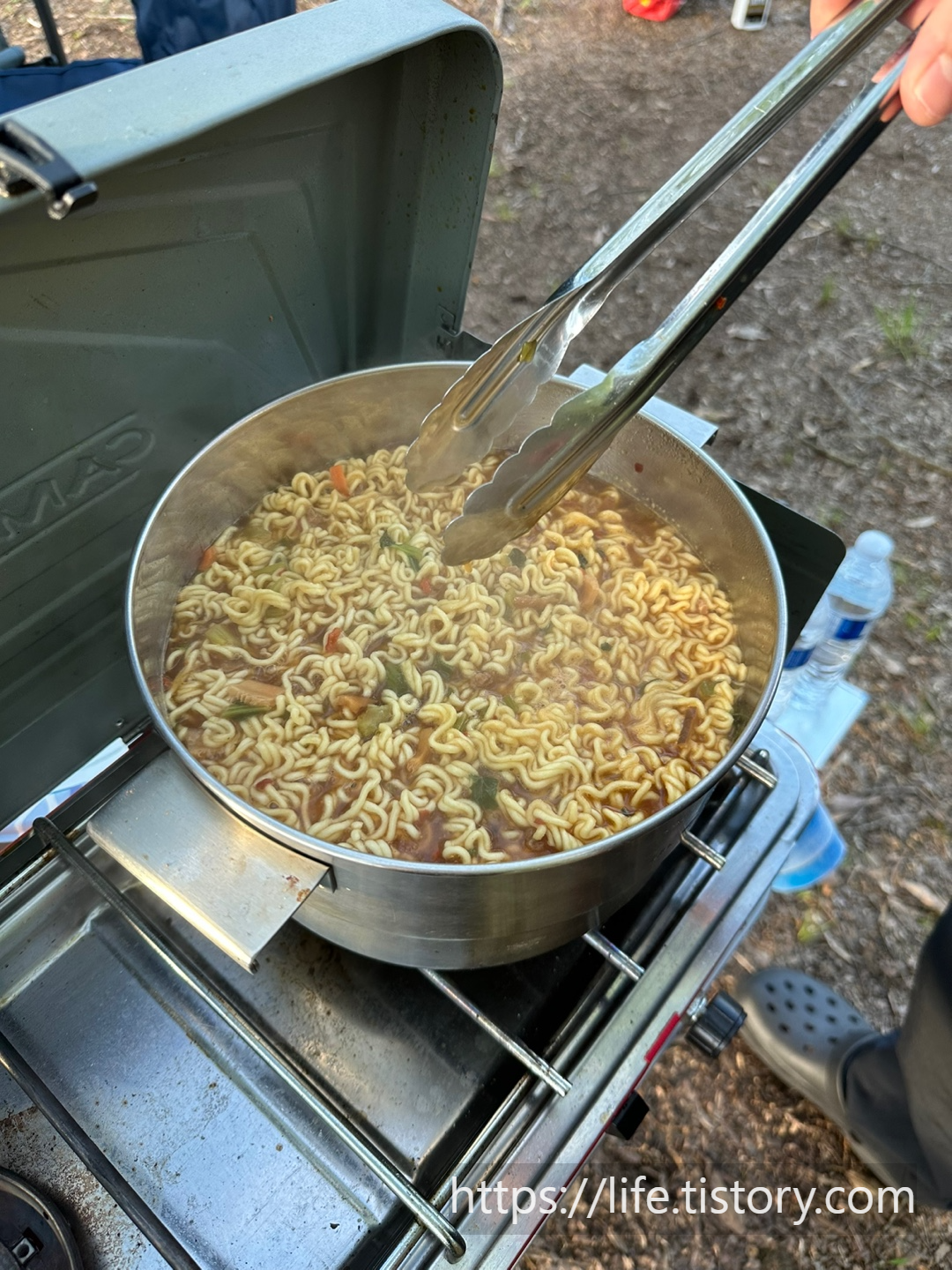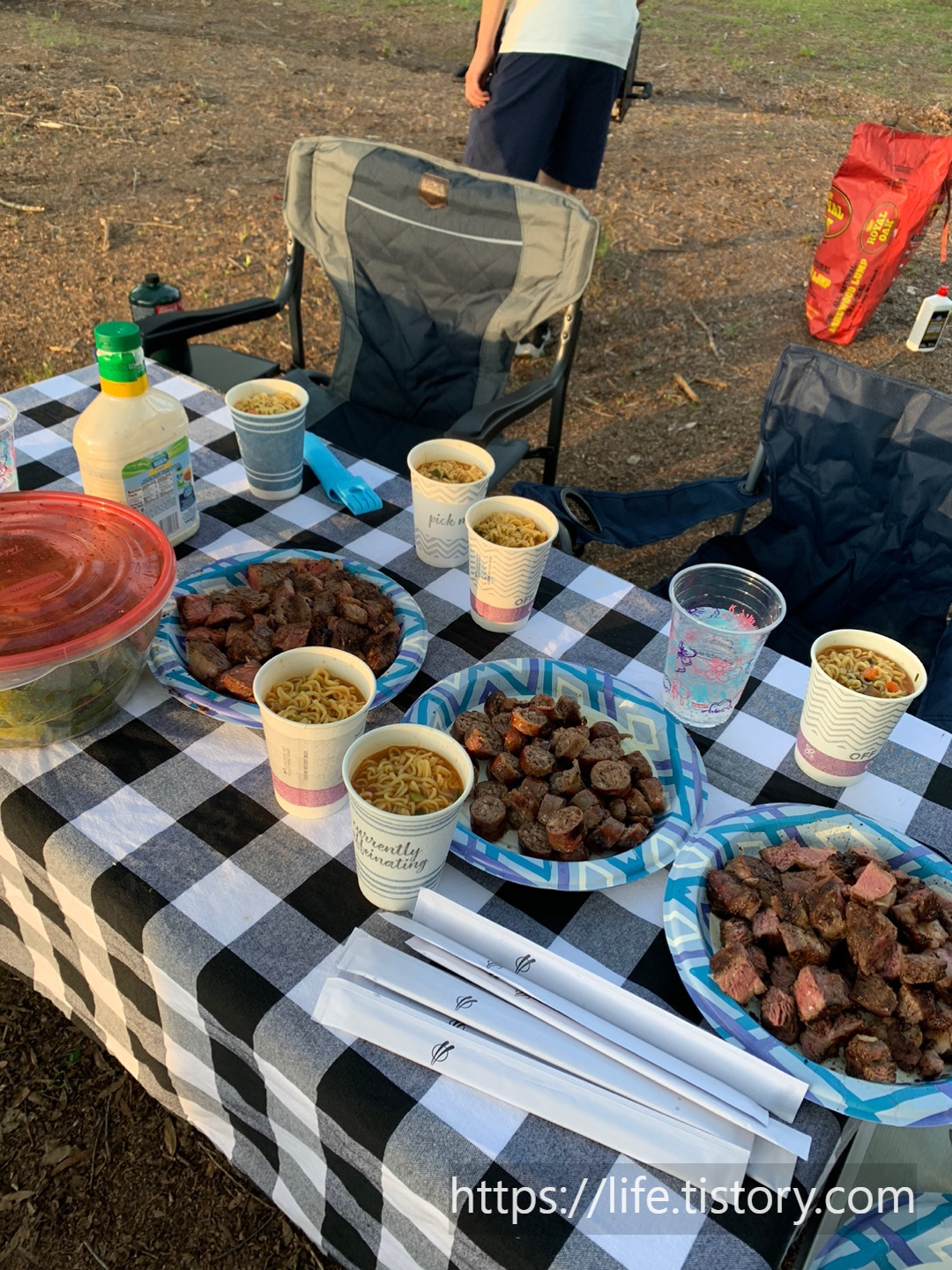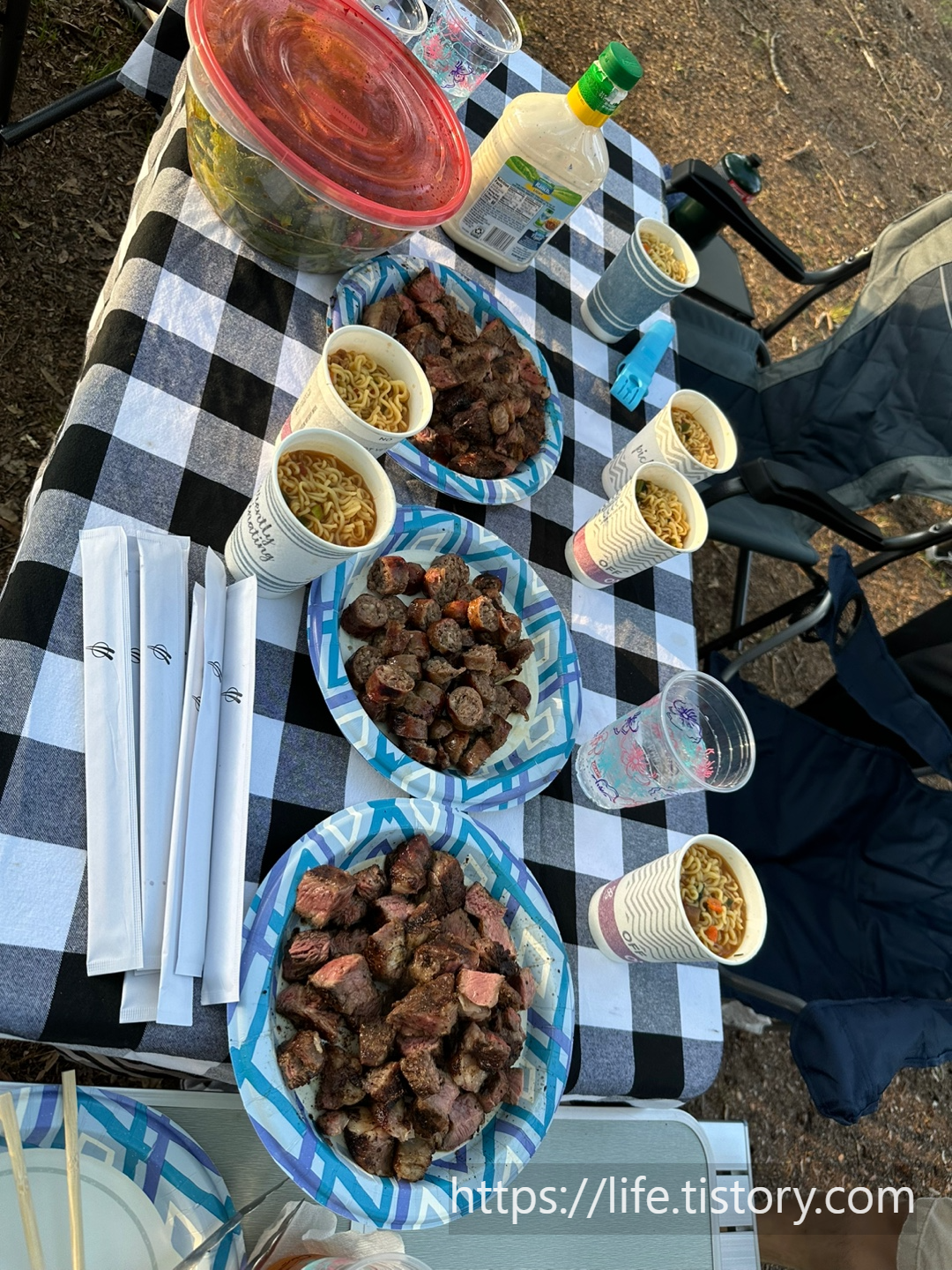 세팅을 착착착 끝내고 고기를 굽고, 라면을 끓였다.