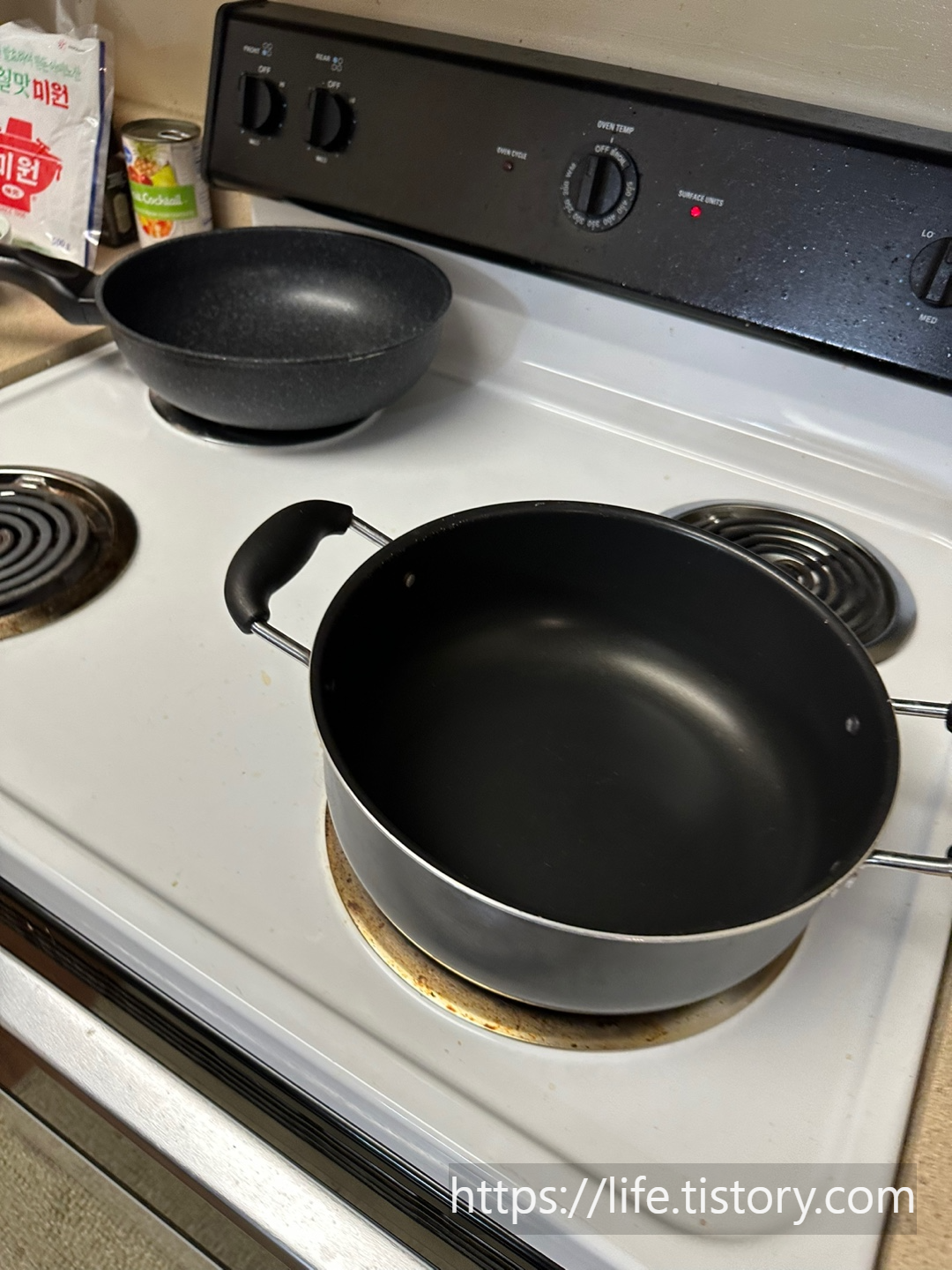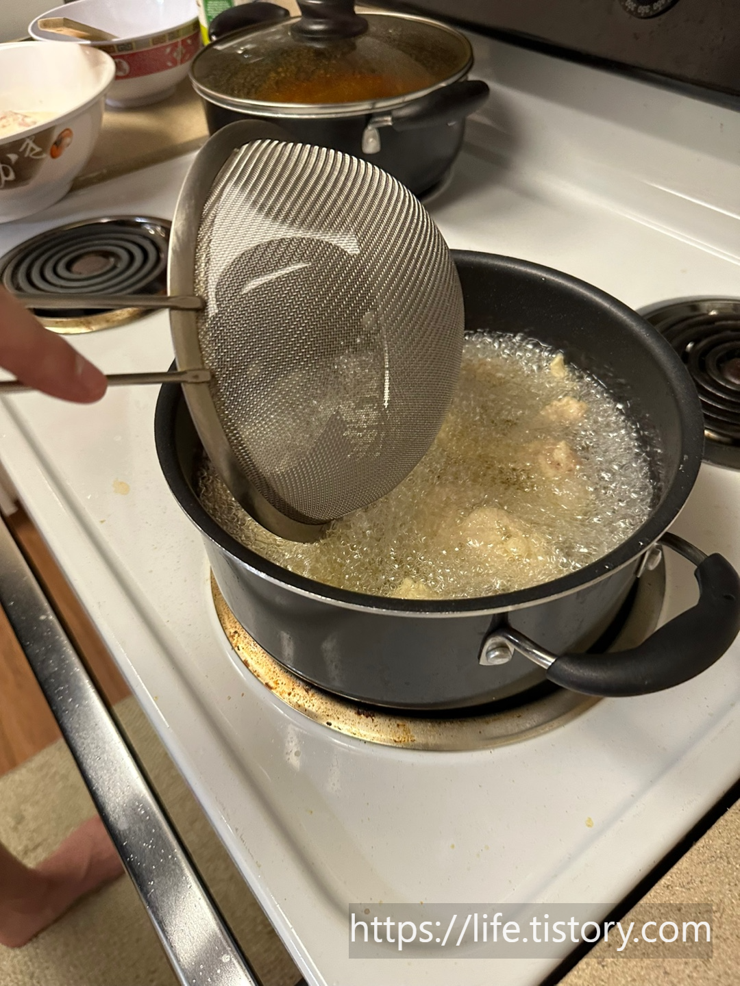 - 팬에 기름을 많이 넣고 기름이 뜨거워지면 튀기기 시작한다.