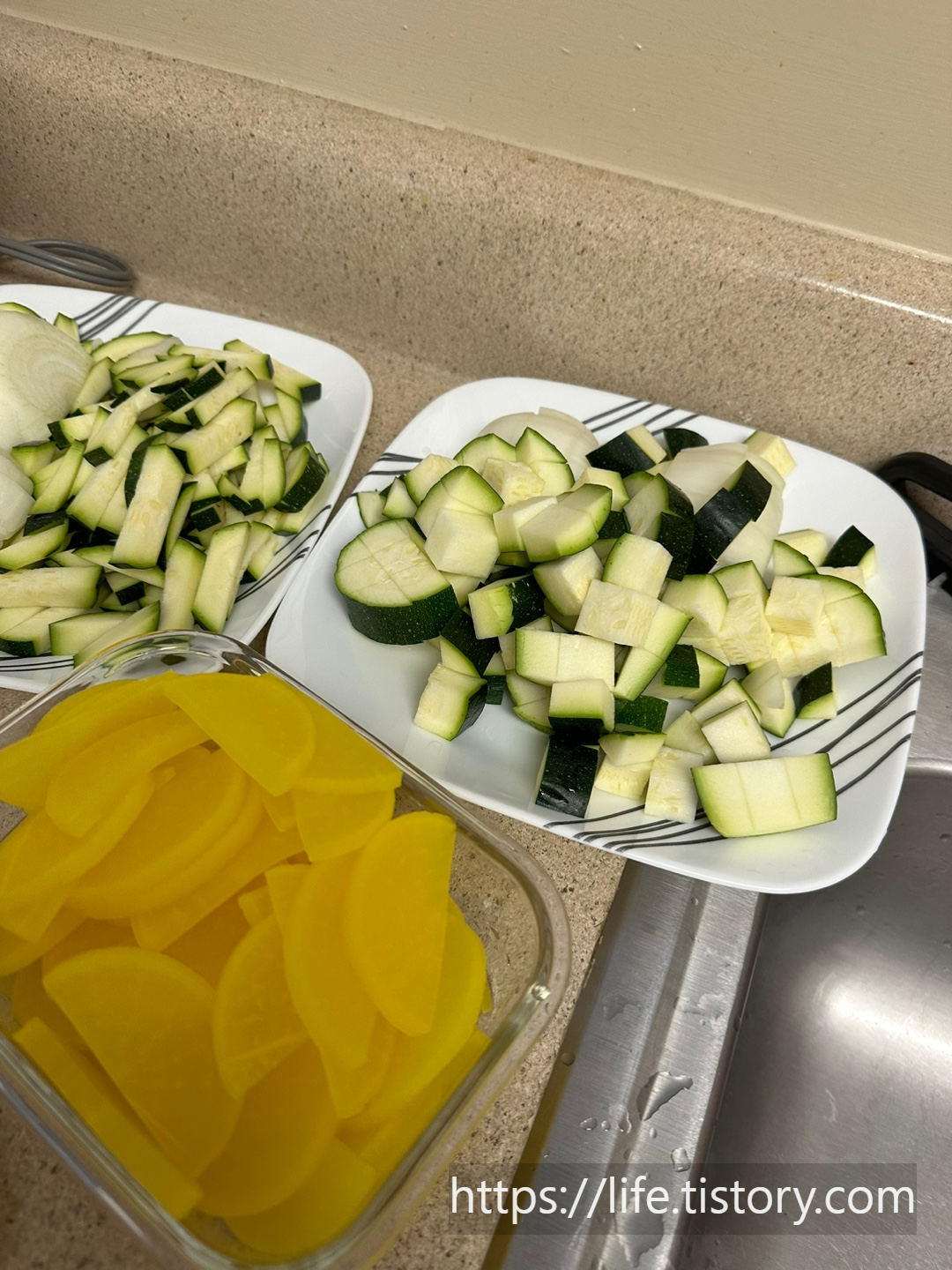 - 팬에 기름을 두르고 양파와 애호박을 볶는다.