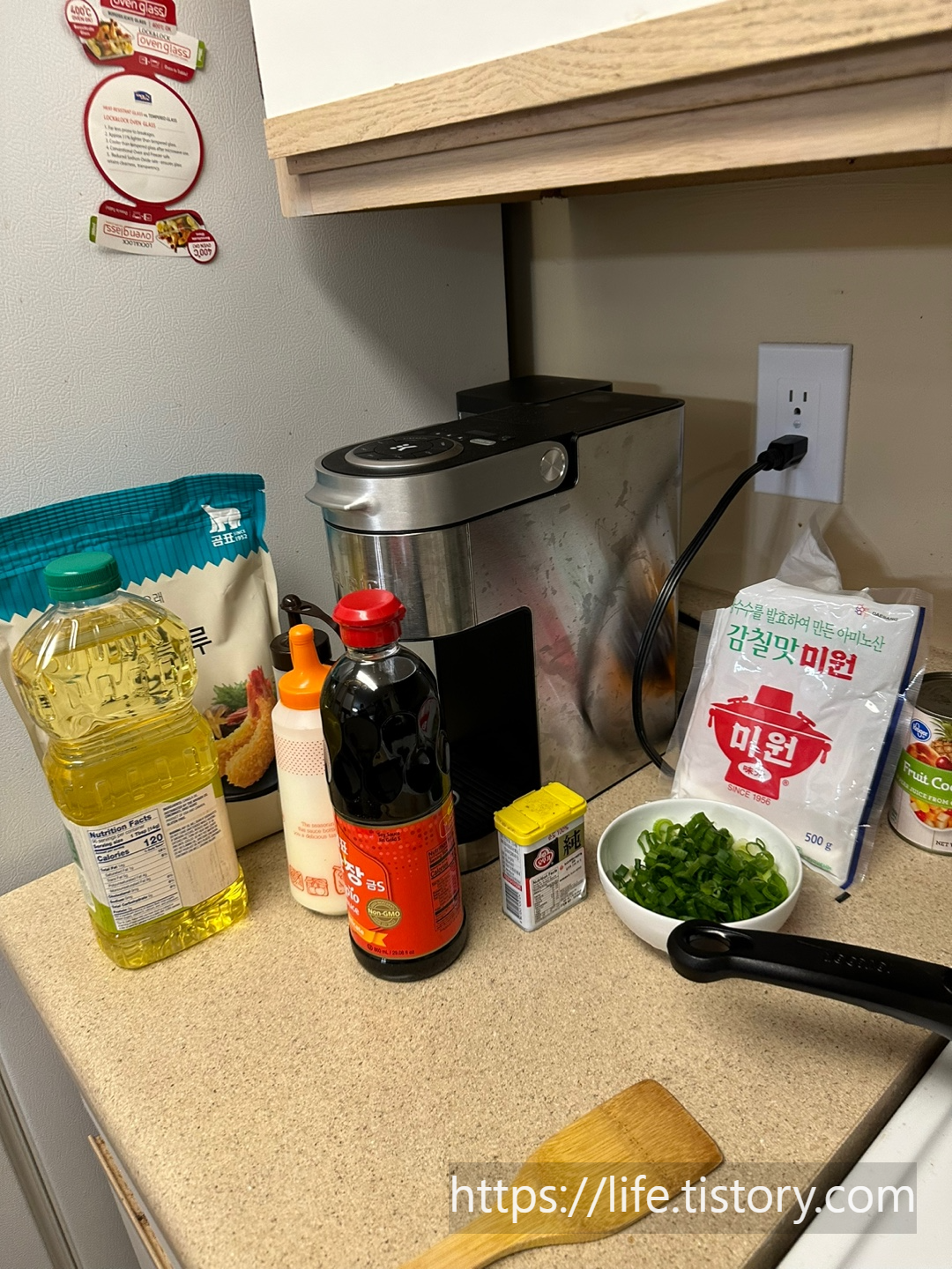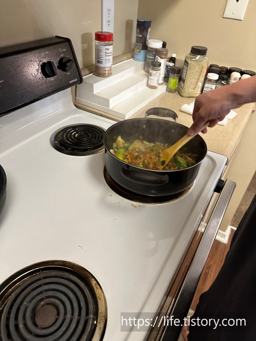 짬뽕국물은 짬뽕라면수프의 힘을 빌렸다. 고춧가루도 넣고 했지만, 미국 전기레인지로는 불맛을 만들기 힘들었다.