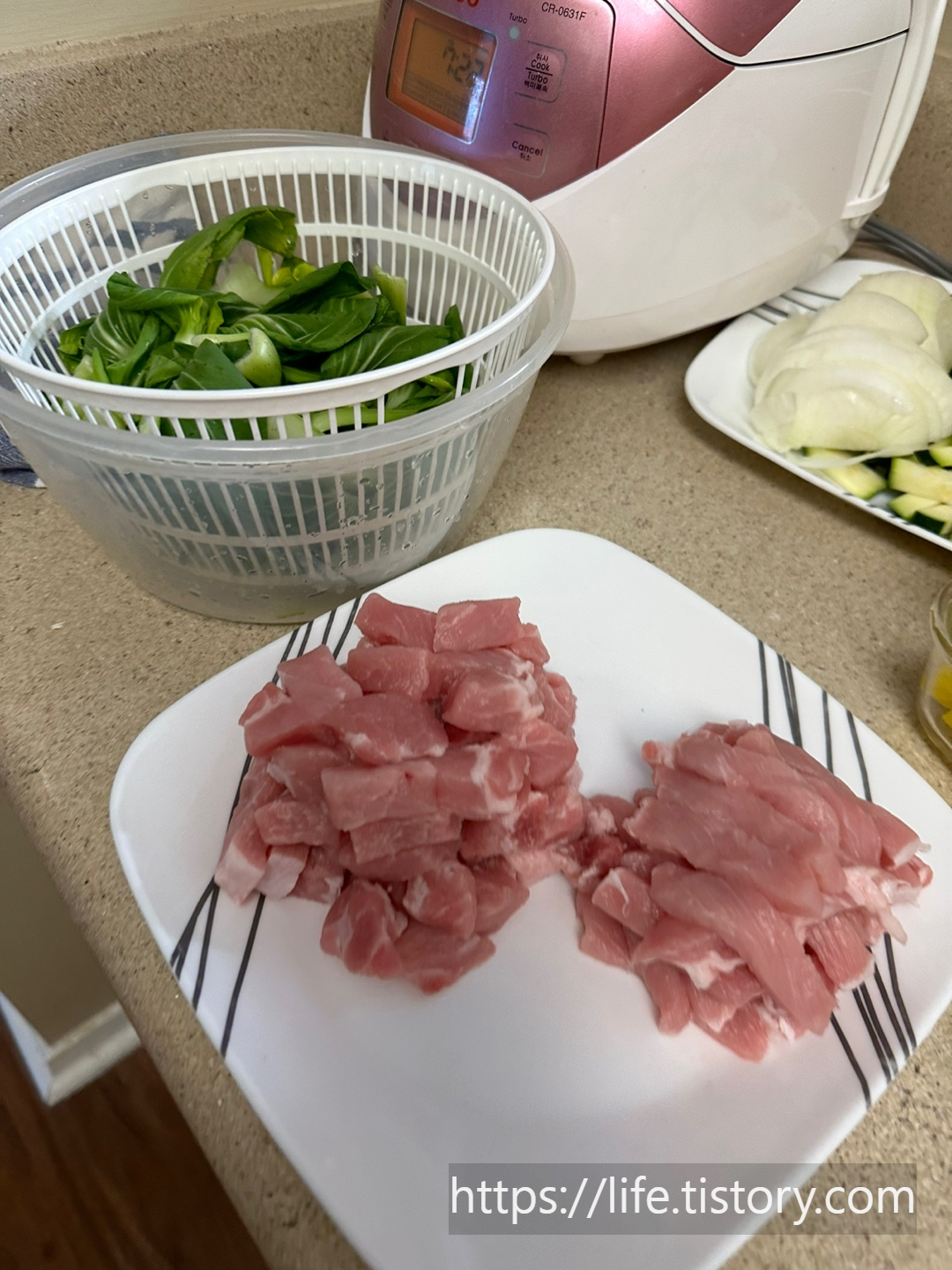 청경채 두 주먹, 돼지고기 돈가스 만들 수 있는 크기로 잘라져 있는 돼지고기 4장, 양파 1개, 애호박 1개