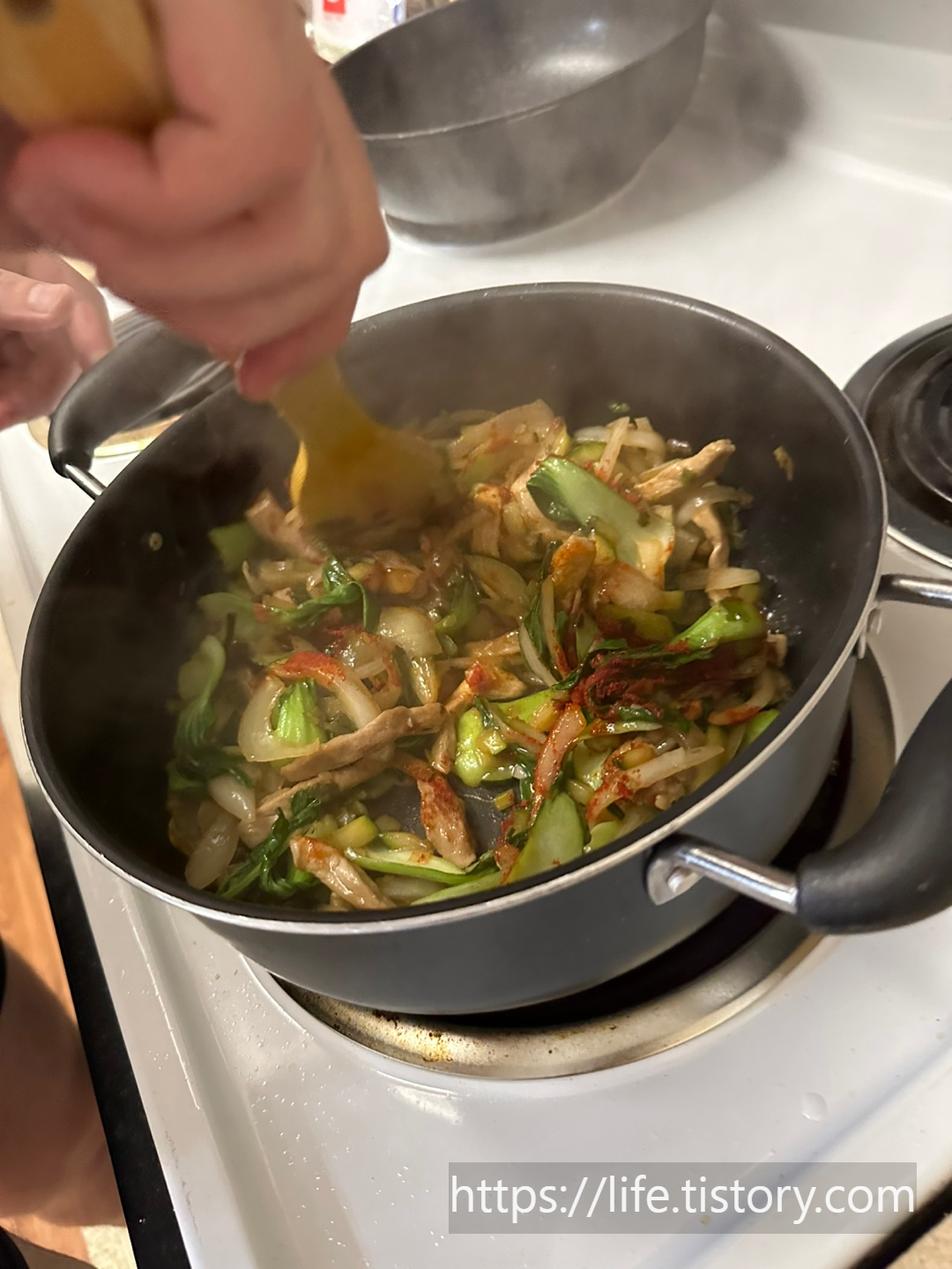 - 양파와 청경채의 식감이 죽지 않게 청경채가 익을 때쯤 불을 끈다.