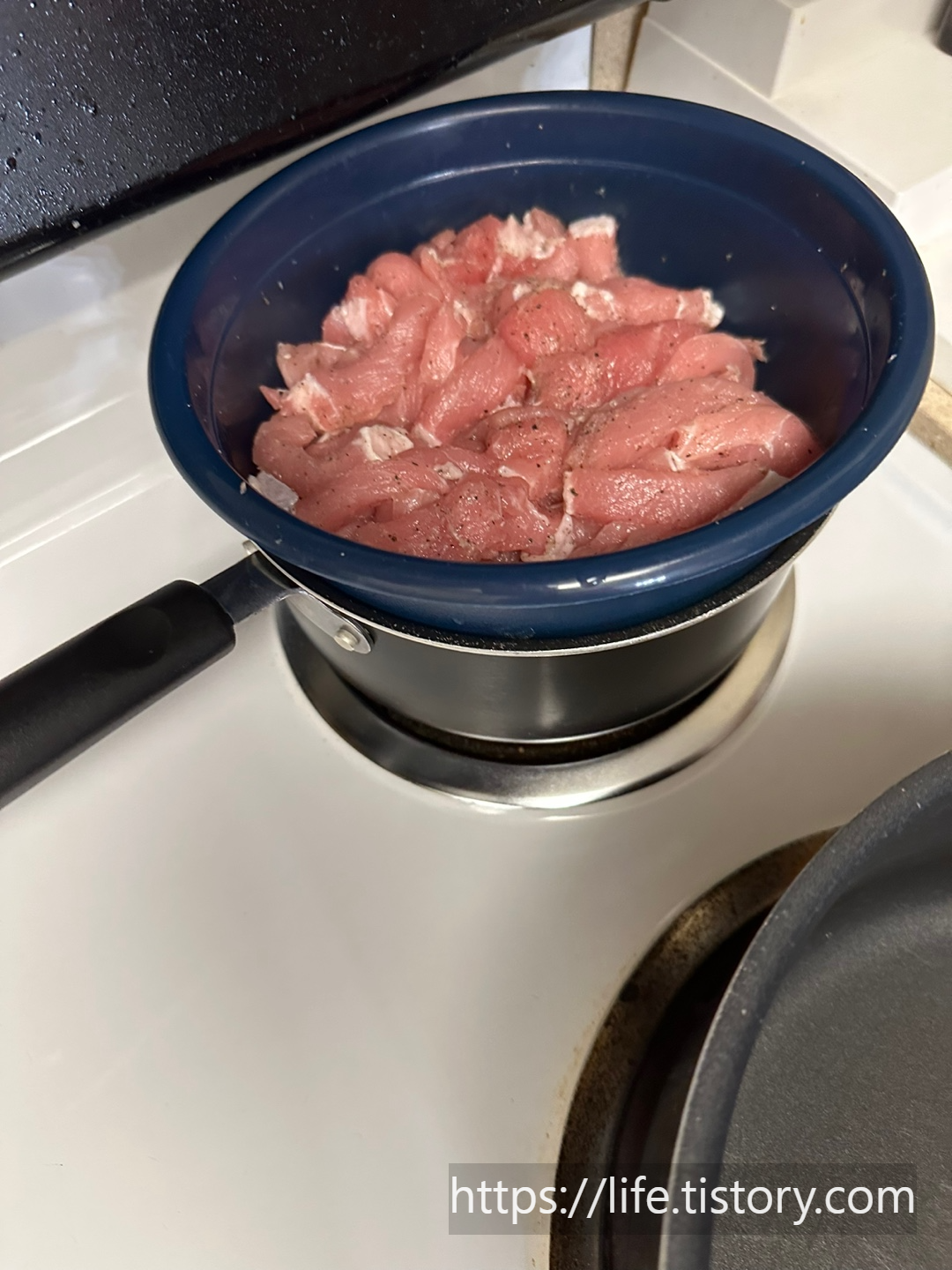 - 돼지고기는 후추와 맛소금으로 밑간을 해둔다.