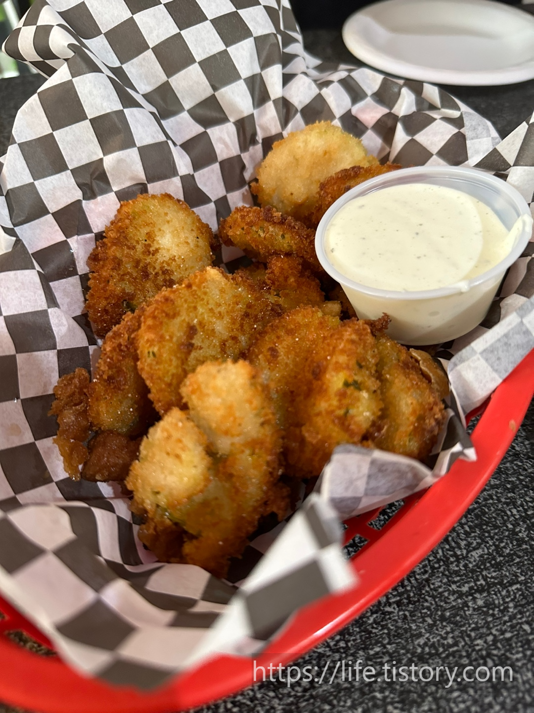 처음 먹어보는 애피타이저, 피클튀김과 버섯튀김이다.