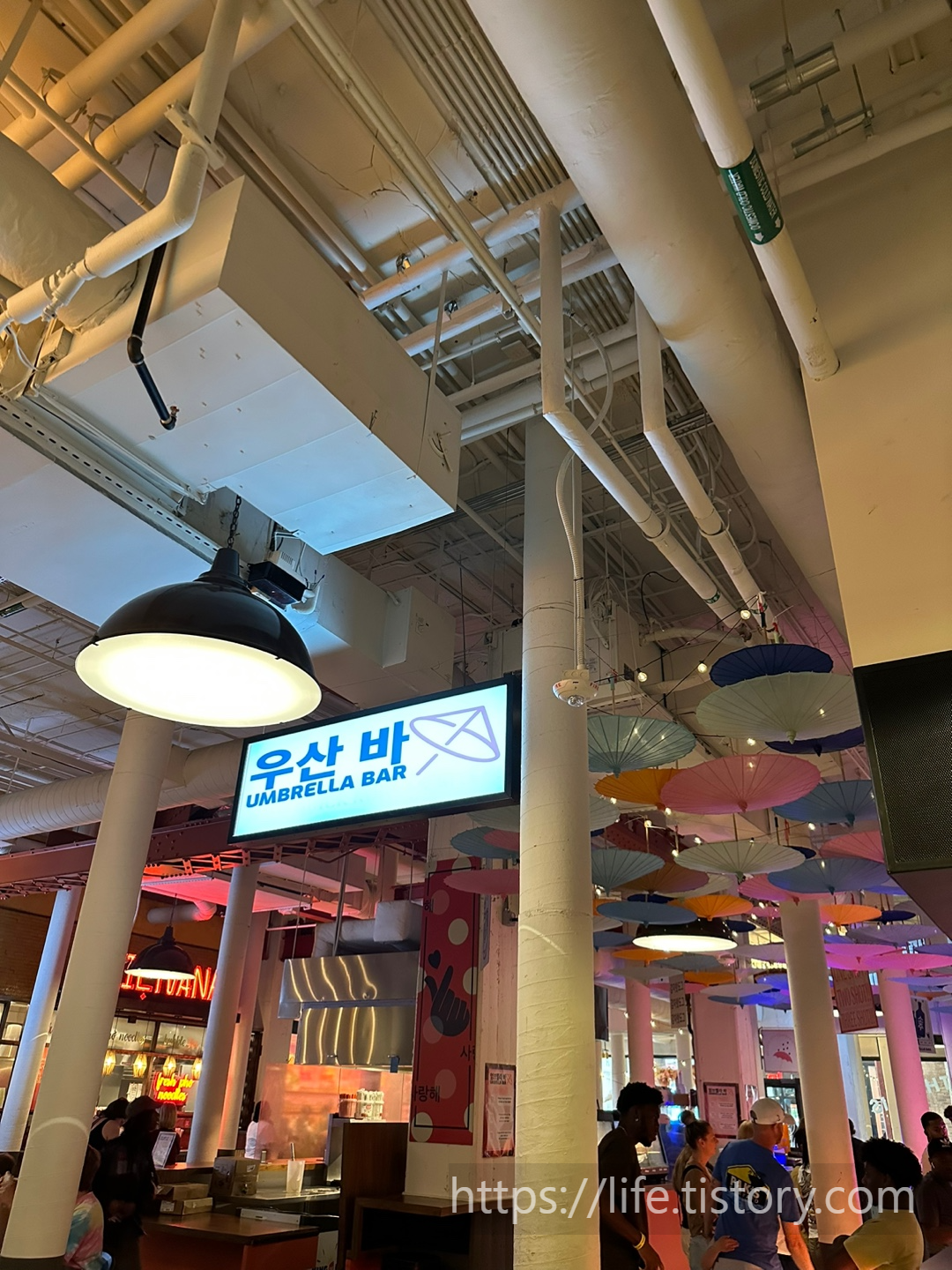 들어가는 입구 쪽에 우산바라고 한글로 적혀있고, 메뉴들도 한식메뉴들인 가게가 있었는데, 손님도 많고 점심을 먹고 와서 구경만 했어요. 분식 위주 메뉴고 핫도그, 떡볶이 등등 여러 가지 메뉴들이 있었어요.
