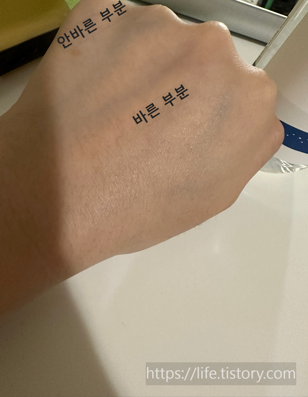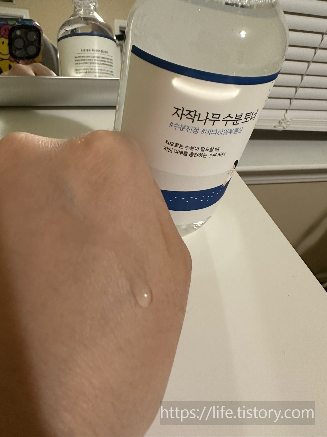 바른 부분이 반짝반짝 빛이 난다. 토너지만 수분 보충이 잘되고 마른 후에도 안 바른 것보다 부드러웠다.