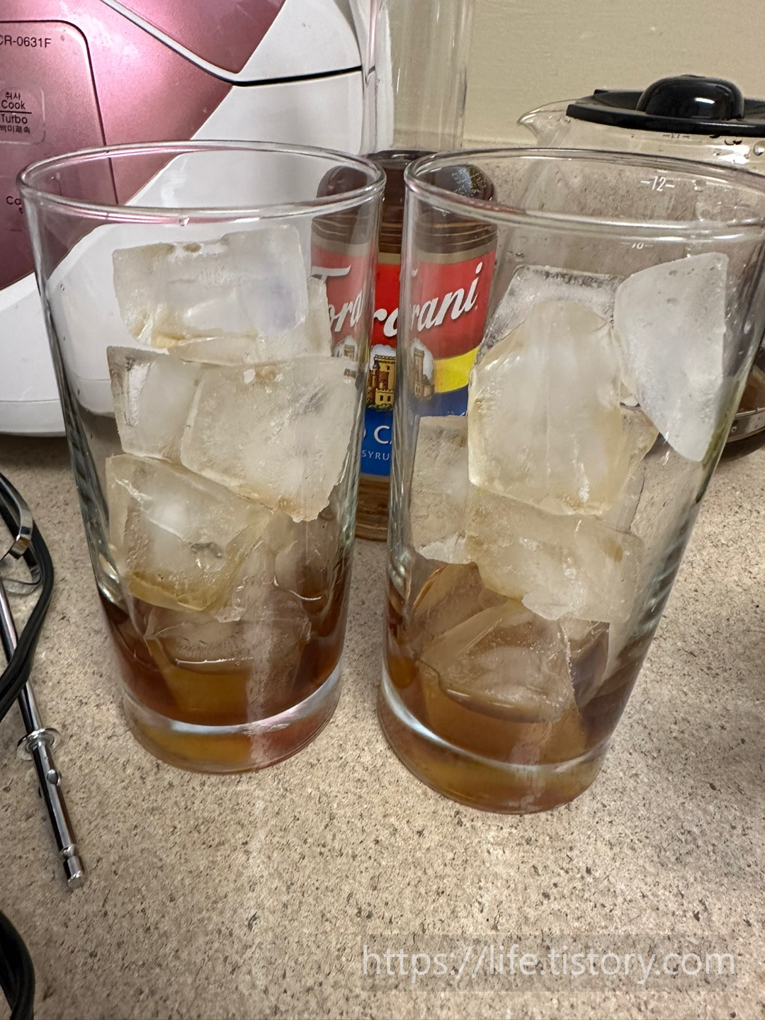 원액을 살짝 넣고 얼음 넣고 물을 넣어 커피를 만들어줍니다.