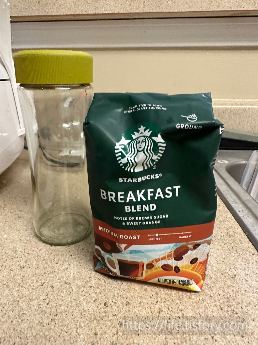 스타벅스 커피가루를 이용해서 빈 병 안에 커피가루와 물을 넣고 냉장고에 넣어둡니다.