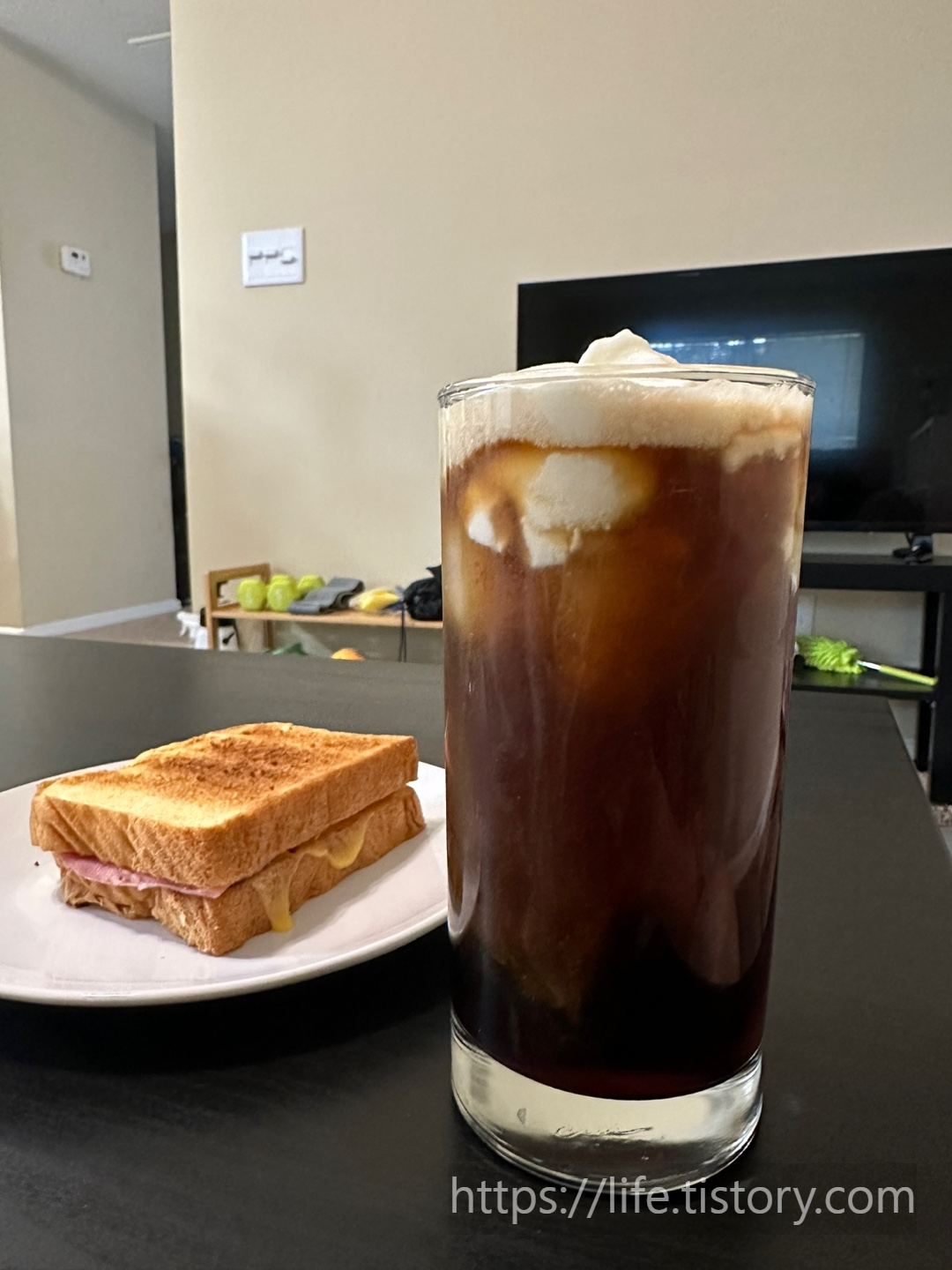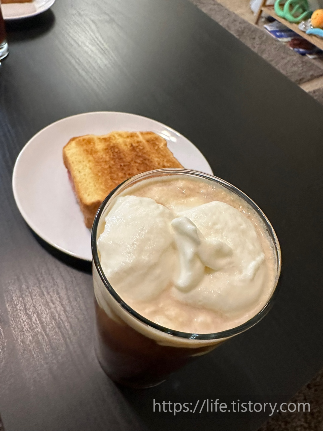 콜드부르 메이커가 있으면 만들어진 커피를 물에 희석시키고 폼을 만들어서 커피 위에 얹어주면 끝입니다.