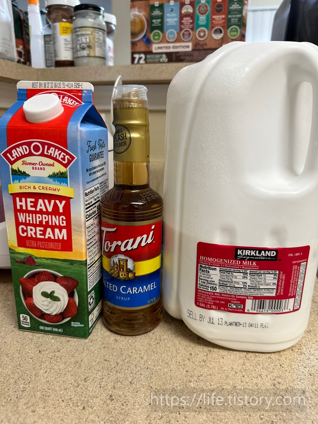 코스트코에서 산 헤비휘핑크림과 타겟에서 산 캐러멜 시럽