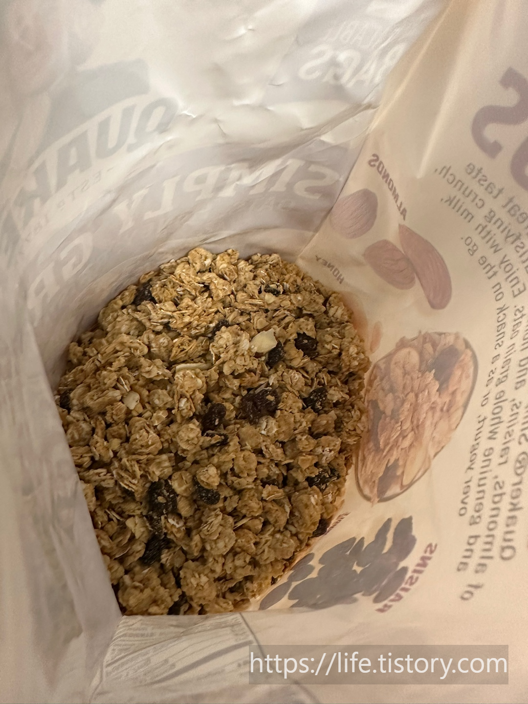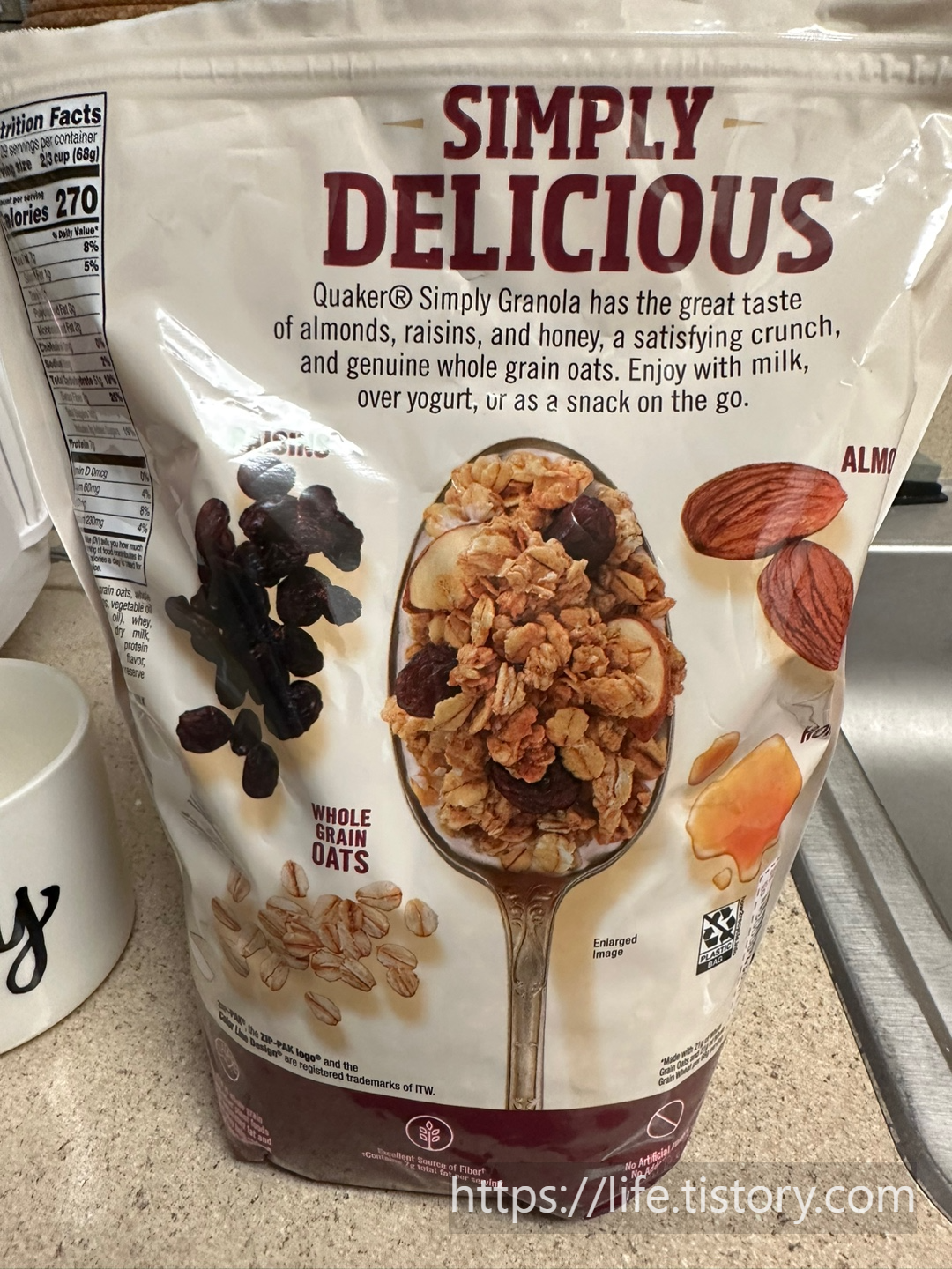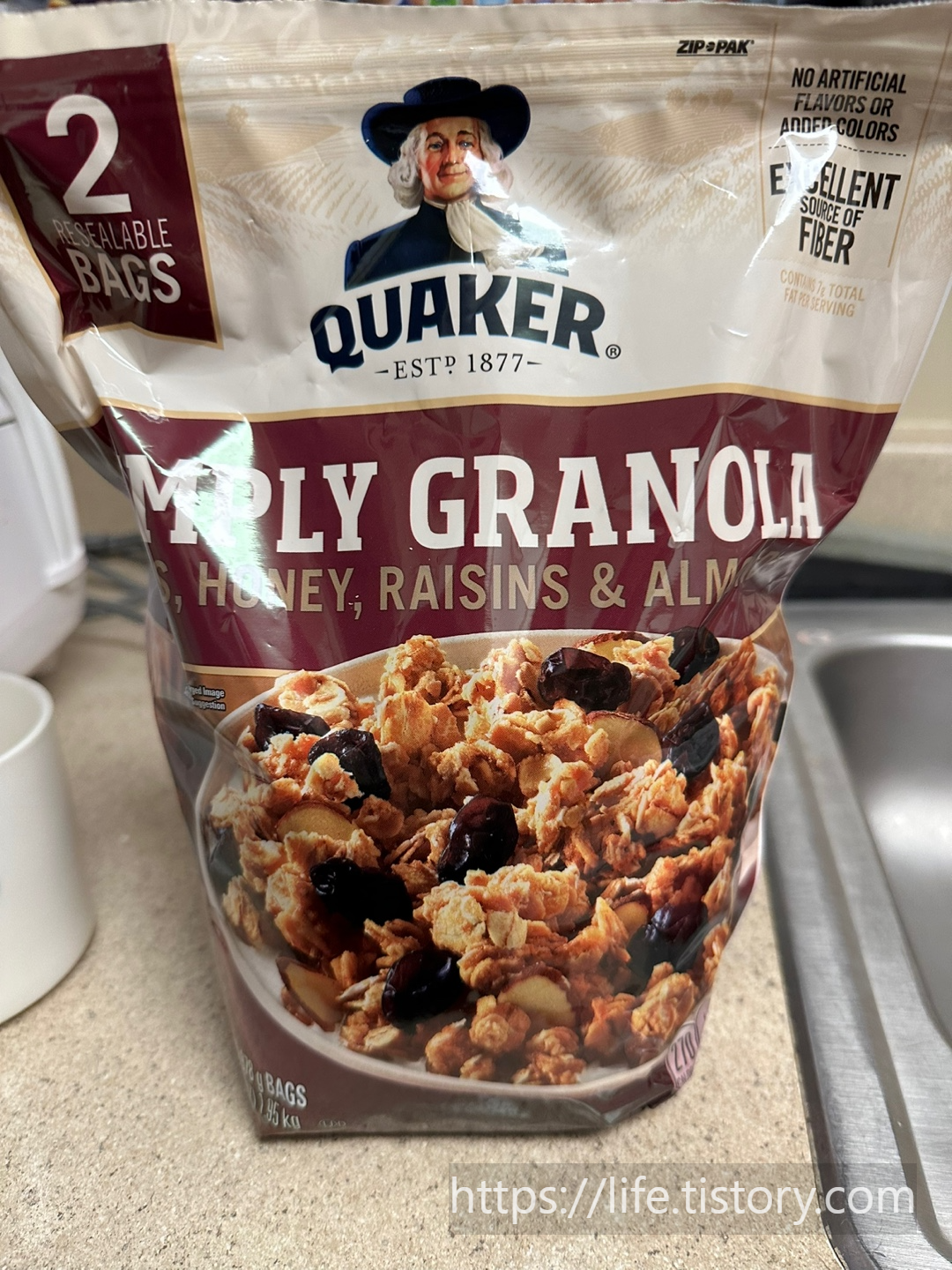 아침에 일찍 일어나면 보통 아침을 잘 안 먹는데, 가볍게 먹기 좋은 게 뭐가 있을까 하다가 찾은 퀘이커 심플리 그래놀라, 2개에 10 몇 불 했던 것 같다.