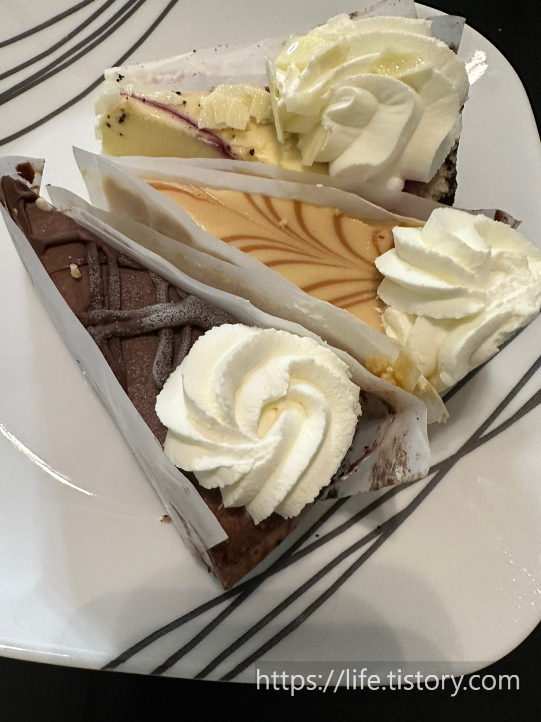 화이트 초콜릿 라즈베리 트러플 치즈케이크, 바닐라빈 치즈케익, 돌체 데 라체(초콜릿케이크인가?), 캐러멜 치즈케이크로 구성되어 있다.