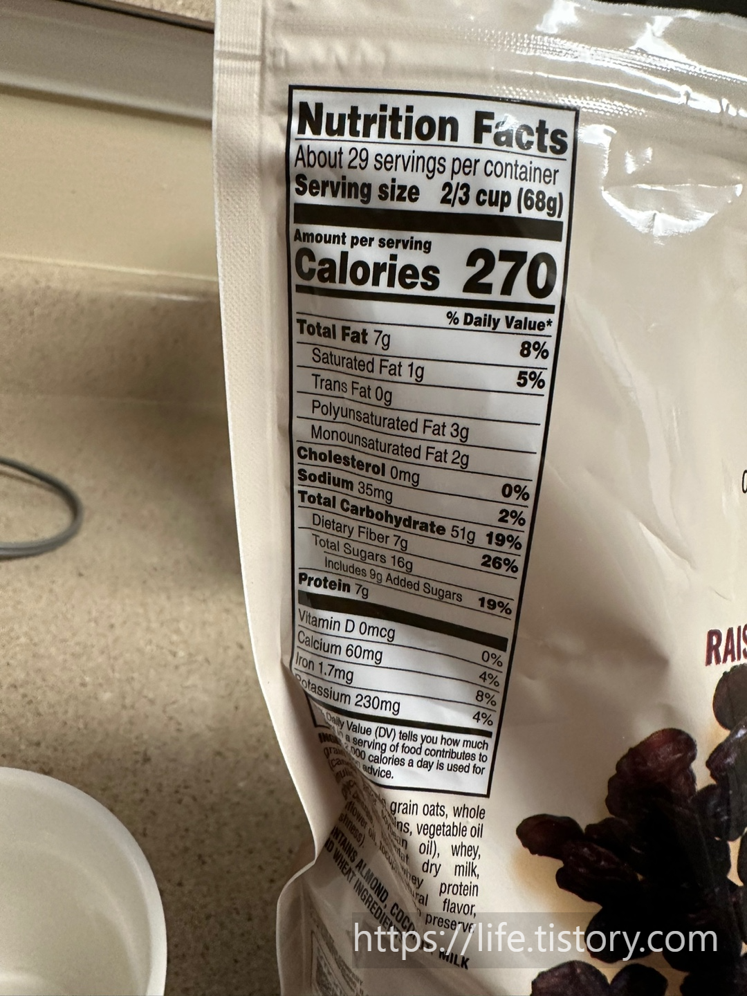 아몬드, 그래놀라, 꿀 등이 들어가 있고 건포도가 들어있어 심심한 맛에 달콤한 맛이 추가됐다.