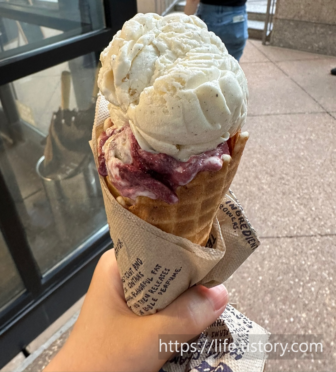 콘에 받아서 먹으면 빨리 녹아서 흐르지만 콘도 그만큼 맛있었습니다.
