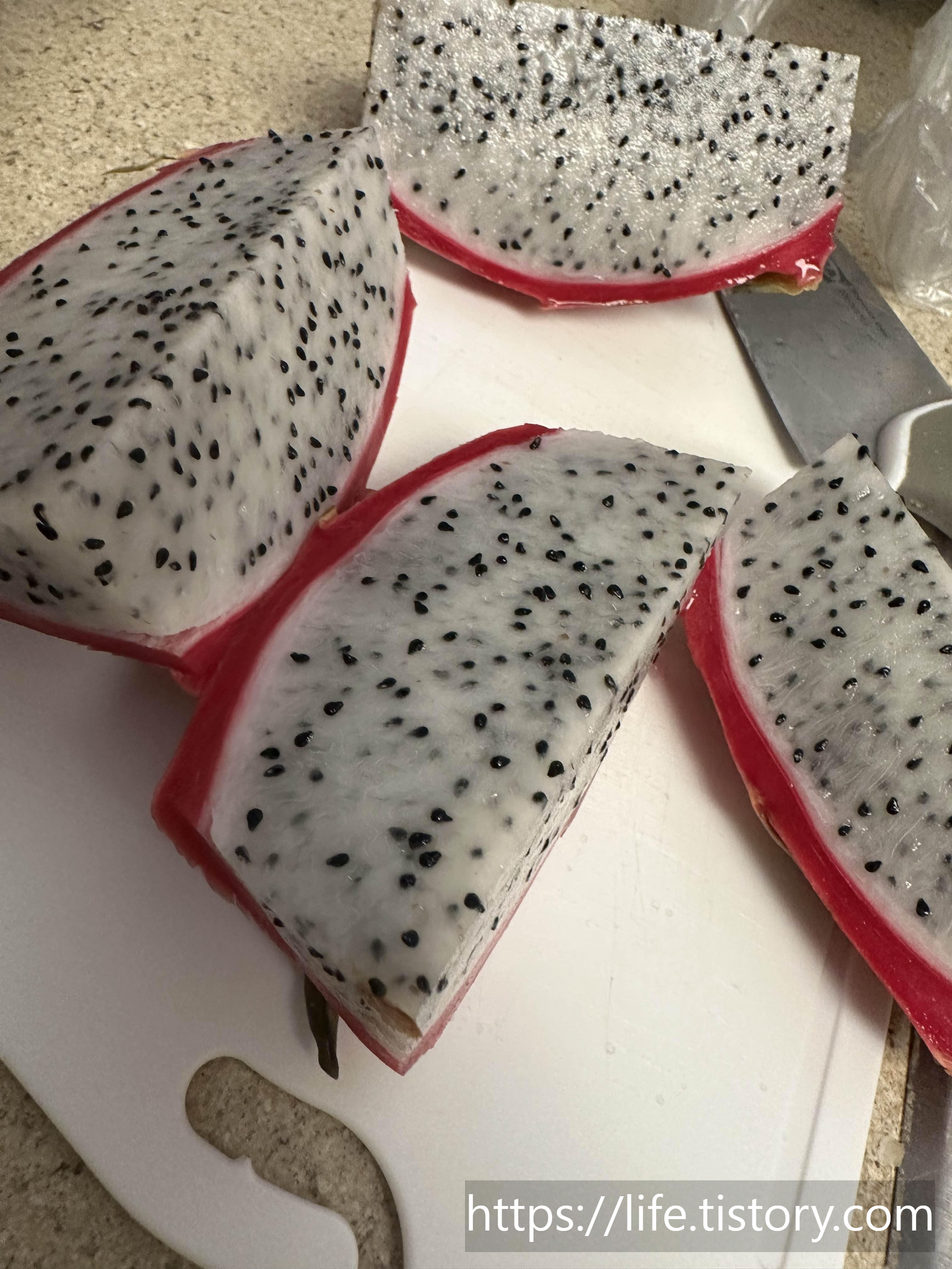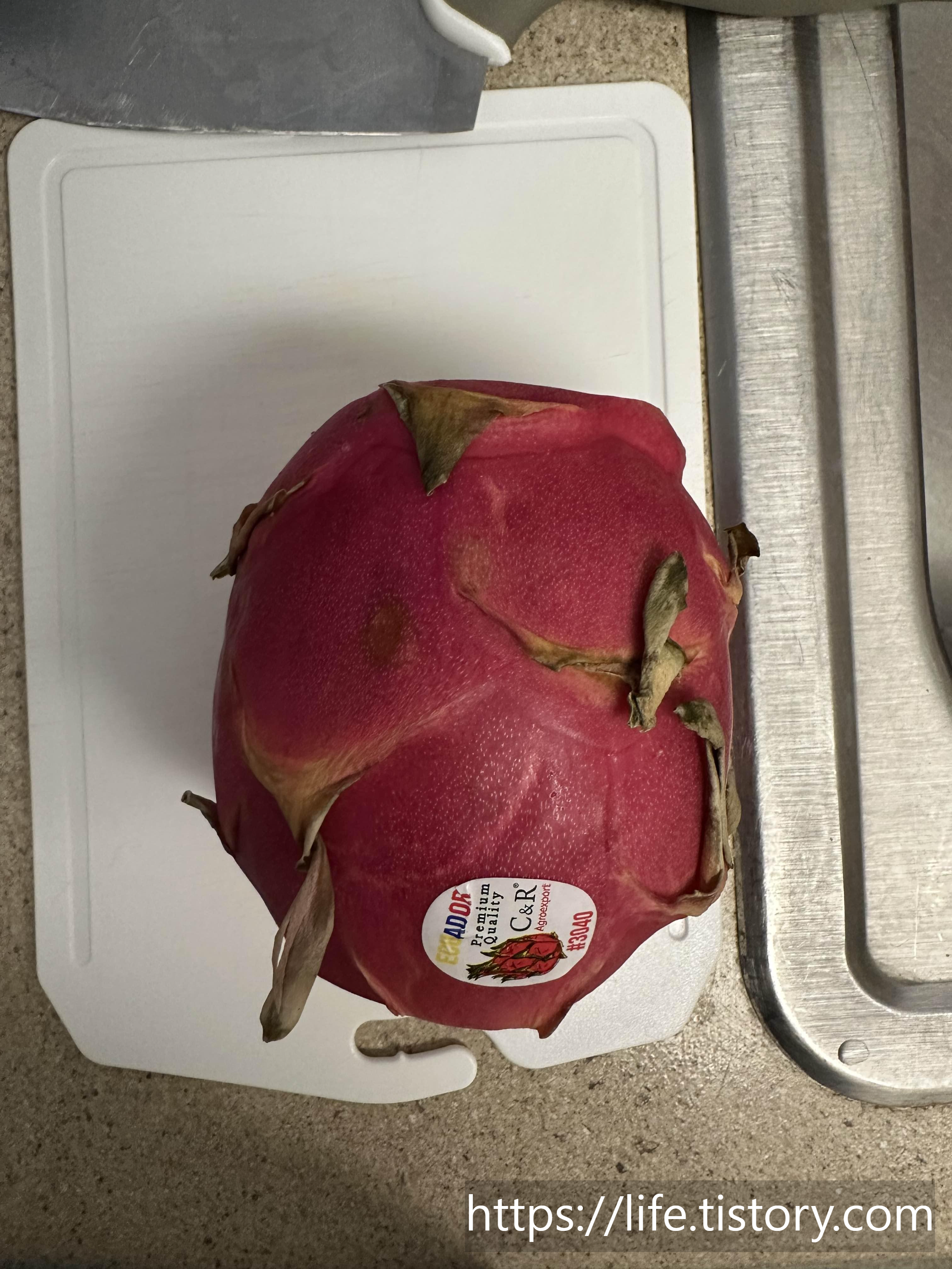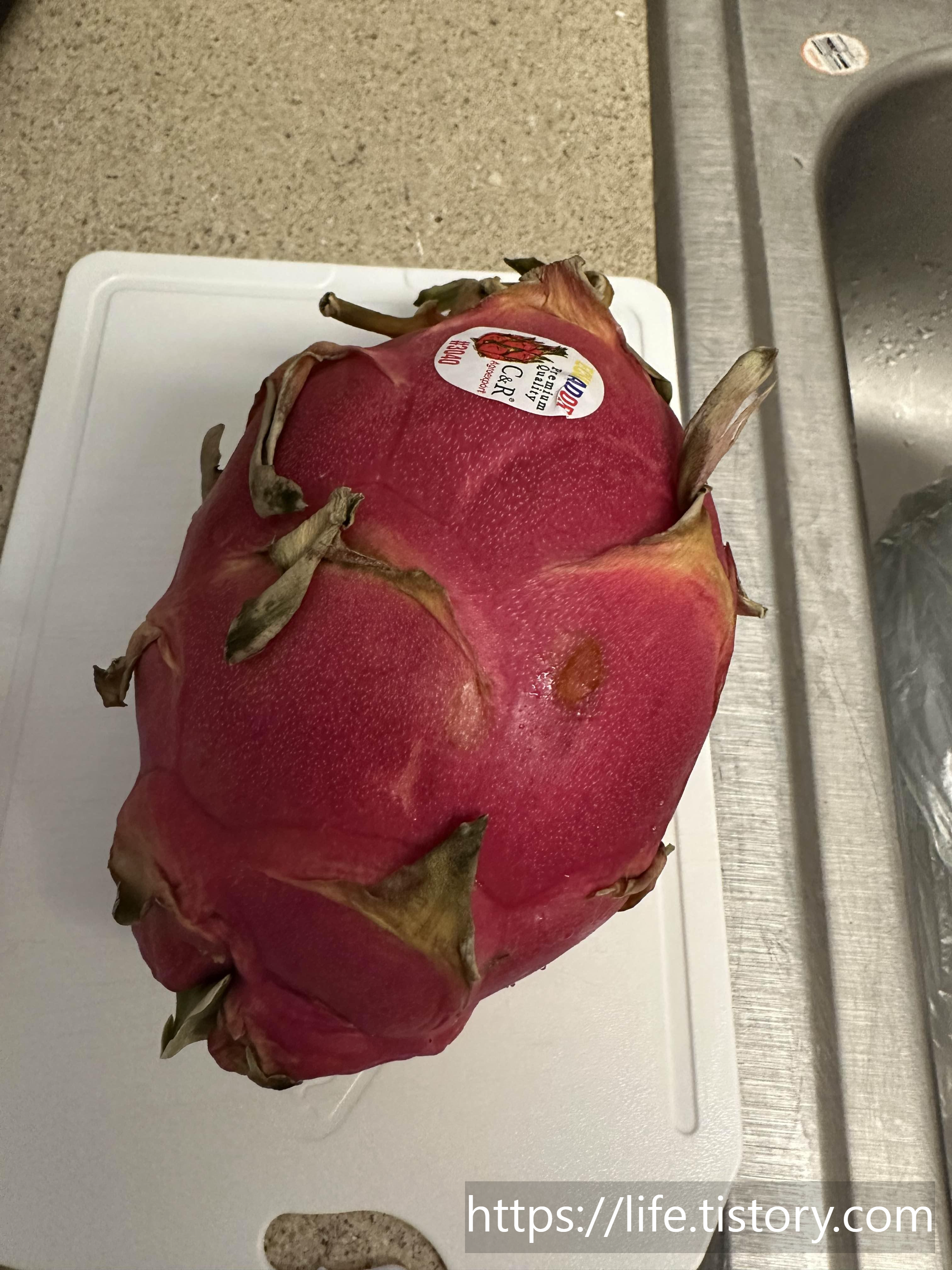 맛있는 용과를 고르면 초록잎이 노란색으로 변했을때 고르면 된다고 하는데, 내가 용과를 살때는 살짝 물렁한 느낌이 드는 용과를 골랐다. 찾아보니 냉장고에 하루,이틀 후숙해서 먹으면 더 맛있게 먹을 수 있다고 한다.