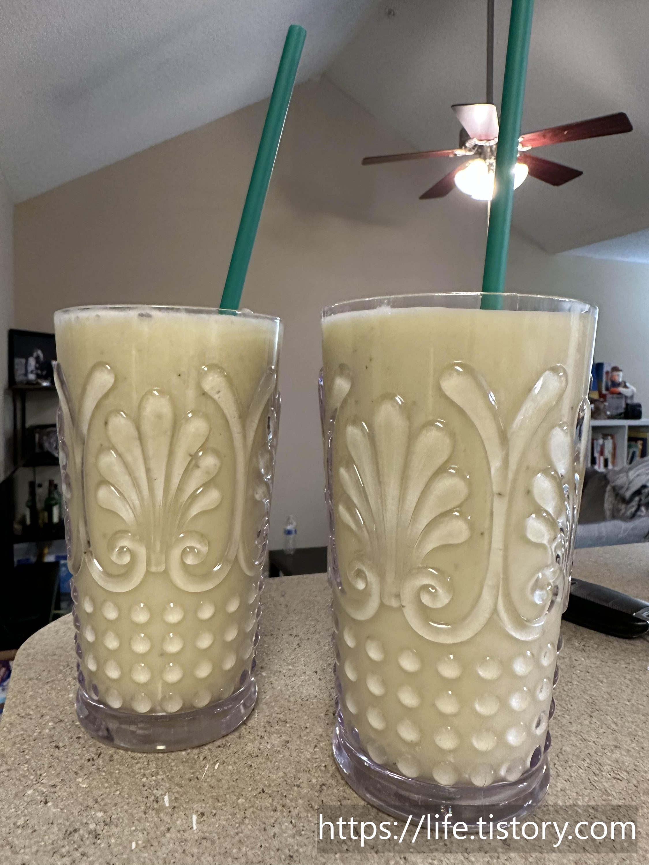 양이 어마어마했다. 바나나가 괜찮다면 한 컵대 바나나 2개 정도만 넣어서 스무디를 만들어도 좋을 것 같다.