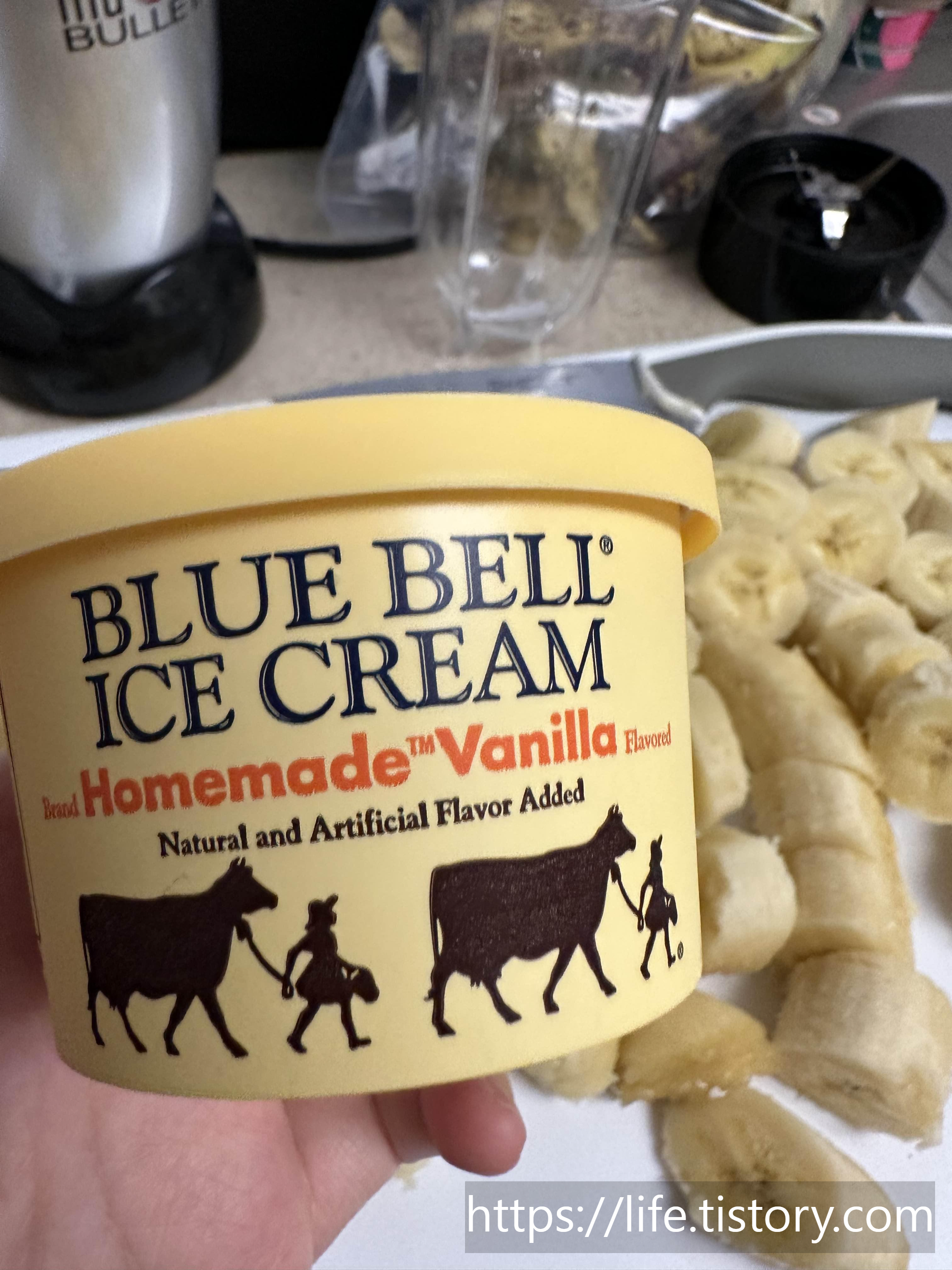 집에 블루벨 아이스크림이 있어서 같이 넣어줬다. 바닐라 아이스크림 특유의 단맛이 잘 섞여서 따로 꿀을 넣지 않아도 됐다. 바나나가 특유의 단맛도 많이 나서 바나나와 우유만 갈아도 충분할 것 같기도 하다.