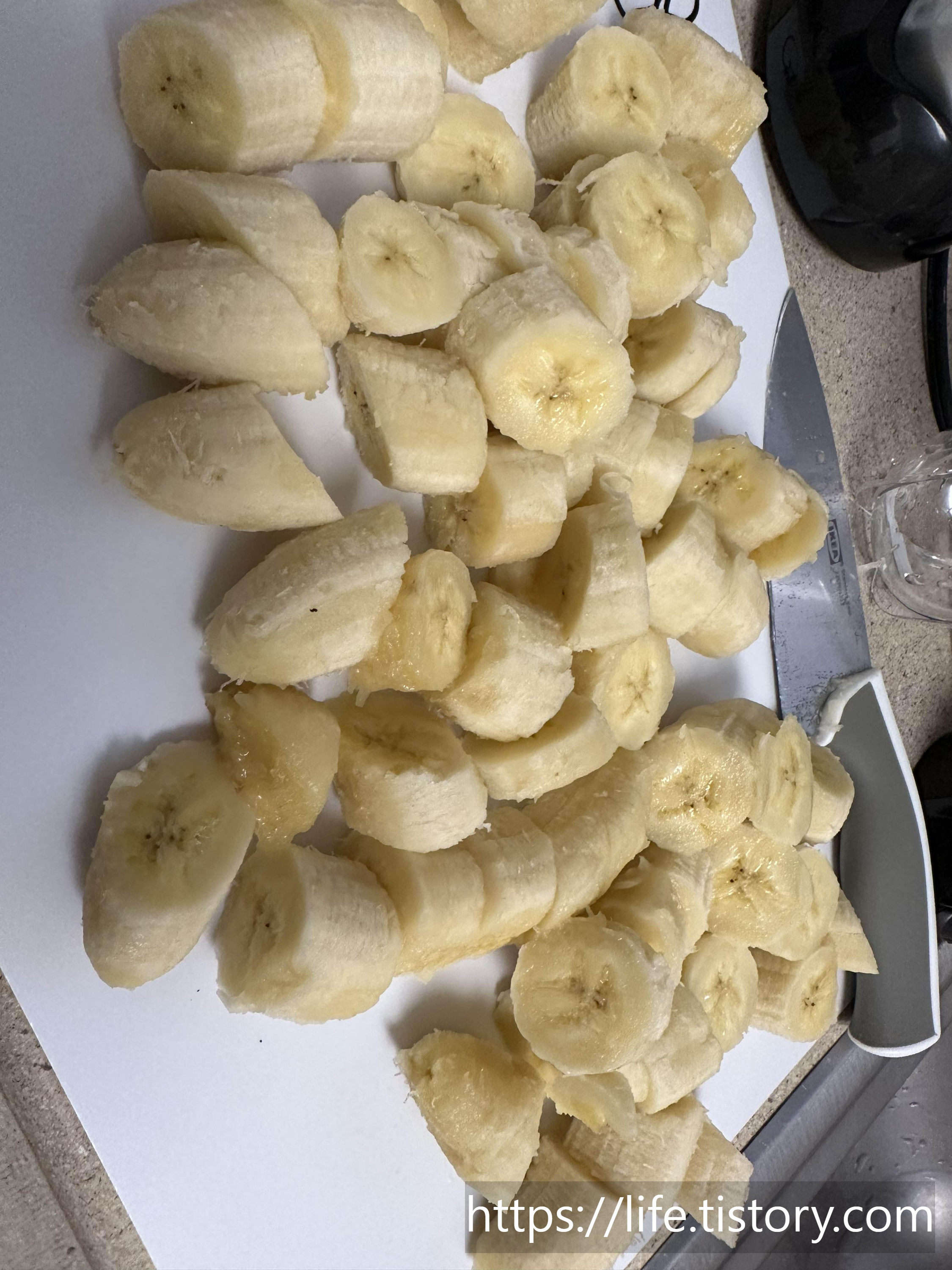 - 알맹이를 갈기 쉬운 크기로 잘라준다.(*보통 스무디 한잔에 3개 정도 넣으면 되는데 바나나 갈변이 심해서 그냥 다 넣었다)