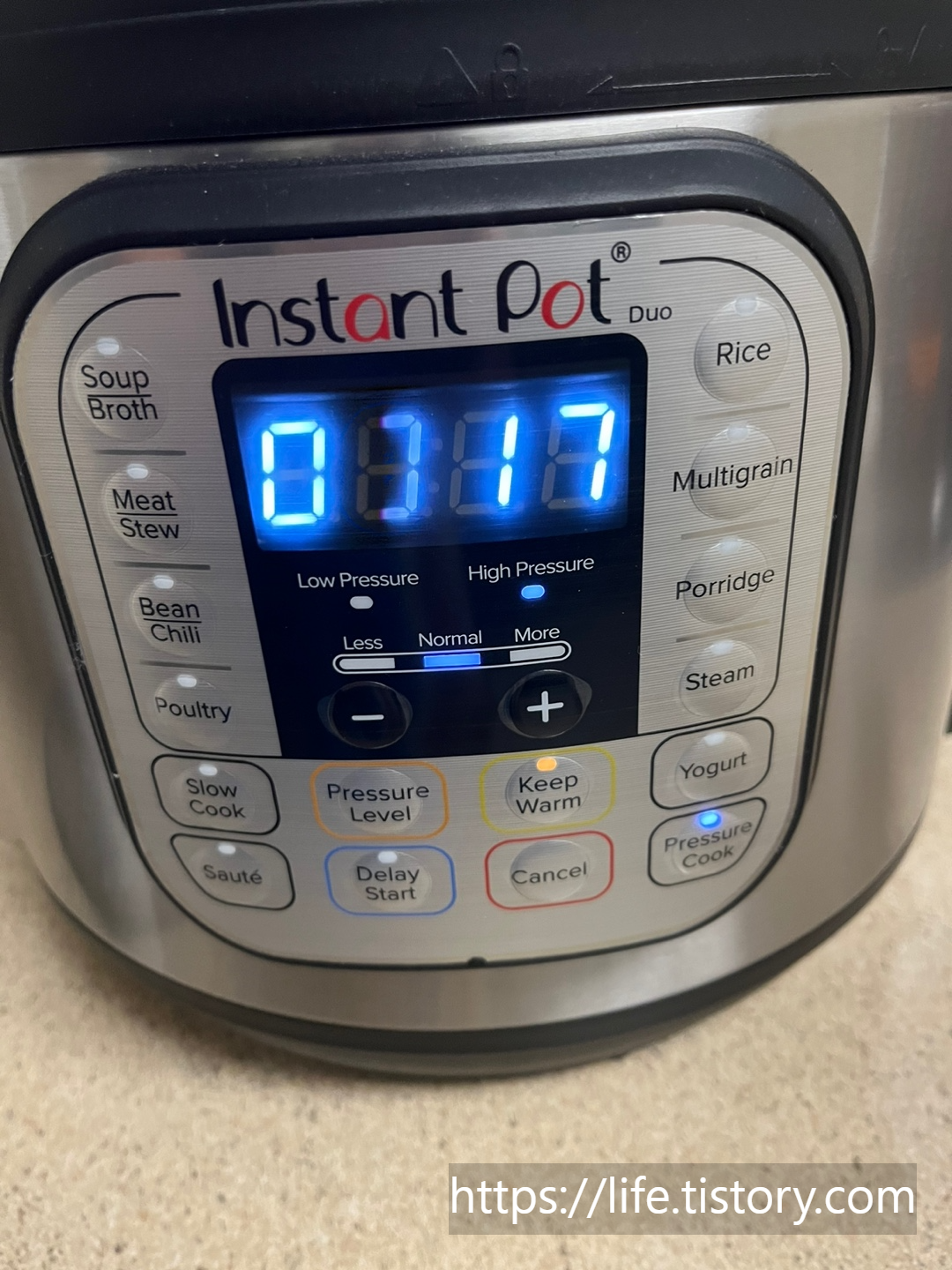 - 압력요리 버튼을 누르고 로우프레셔로 설정한 후 시간을 17분으로 설정한다.