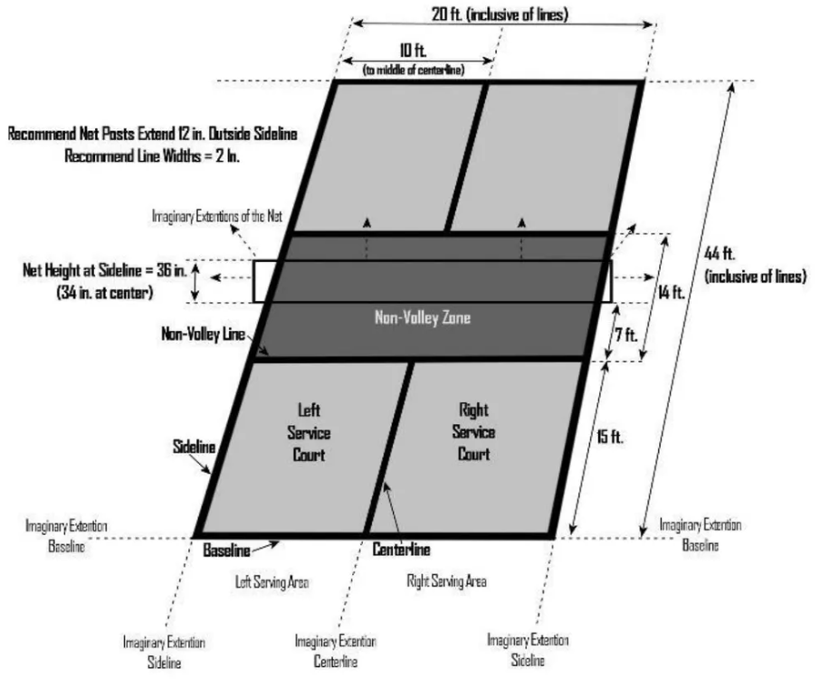 코트의 규정 크기는 복식과 단식 모두 20피트(6.1m) x 44피트(13m)로 복식 배드민턴 코트와 같은 크기이다. 네트에서 7피트 떨어진 라인은 발리를 할 수 없는 키친존을 표시한 라인으로 논발리 라인이나 키친 라인으로 불린다. 네트에서 22피트 떨어진 베이스 라인은 경기장의 외부 경계를 표시한다. 논발리 라인과 베이스 라인 사이의 영역은 서비스 코트다. 센터 라인은 서비스 코트를 왼쪽과 오른쪽으로 나눈다.
