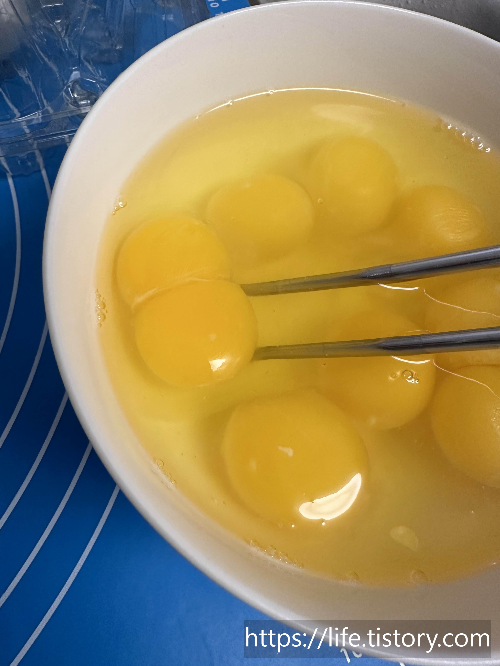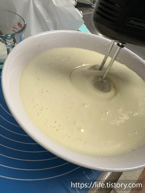 4. 흰자의 머랭이 완성되면 분리시켜 둔 노른자와 함께 다시 한번 섞어준다.