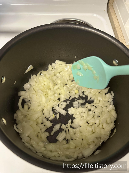 3. 올리브유를 넣고 양파를 투명해질 때까지 볶아 줍니다.