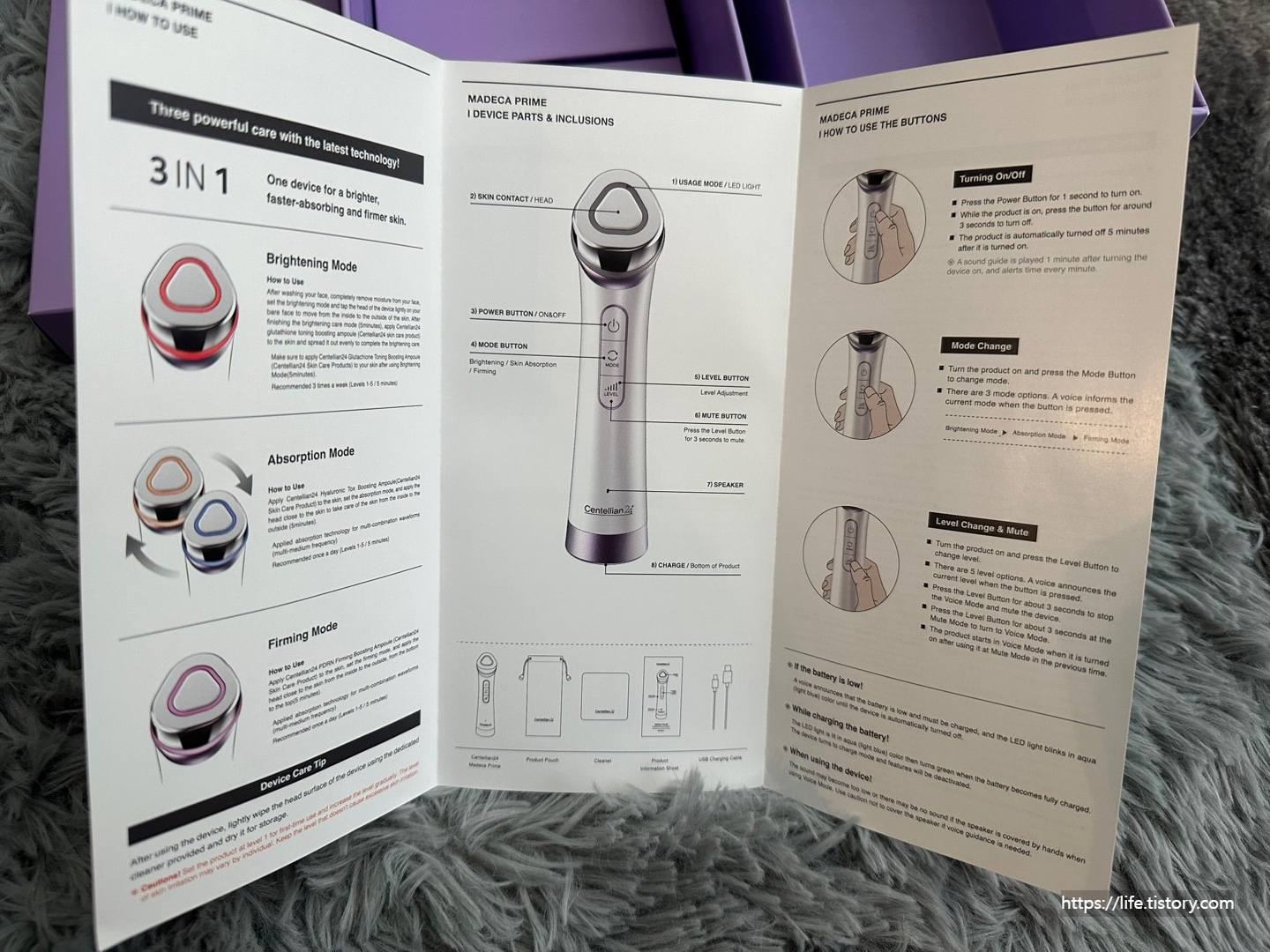 전원을 켜면 스피커에서 "센텔리안 24 마데카 프라임입니다." 소개와 함께 어떤 모드인지 소리가 나오더라고요. 그리고 시간도 분단위로 재줍니다. 1분 지났습니다. 등등 그 후에 5분이 다 차면 스스로 꺼집니다.