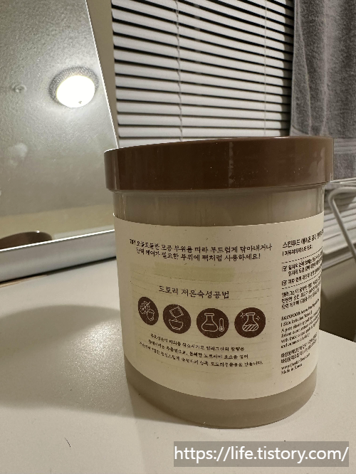 박스를 열면 플라스틱통으로 된 제품이 나옵니다. 심플하게 생겼는데 도토리가 생각나게 도토리묵 색을 사용했나 봐요. 뚜껑은 도토리묵 색상 통은 연한 아이보리색이에요. 설명은 박스에 써진 설명들이 간단하게 적혀있어요.