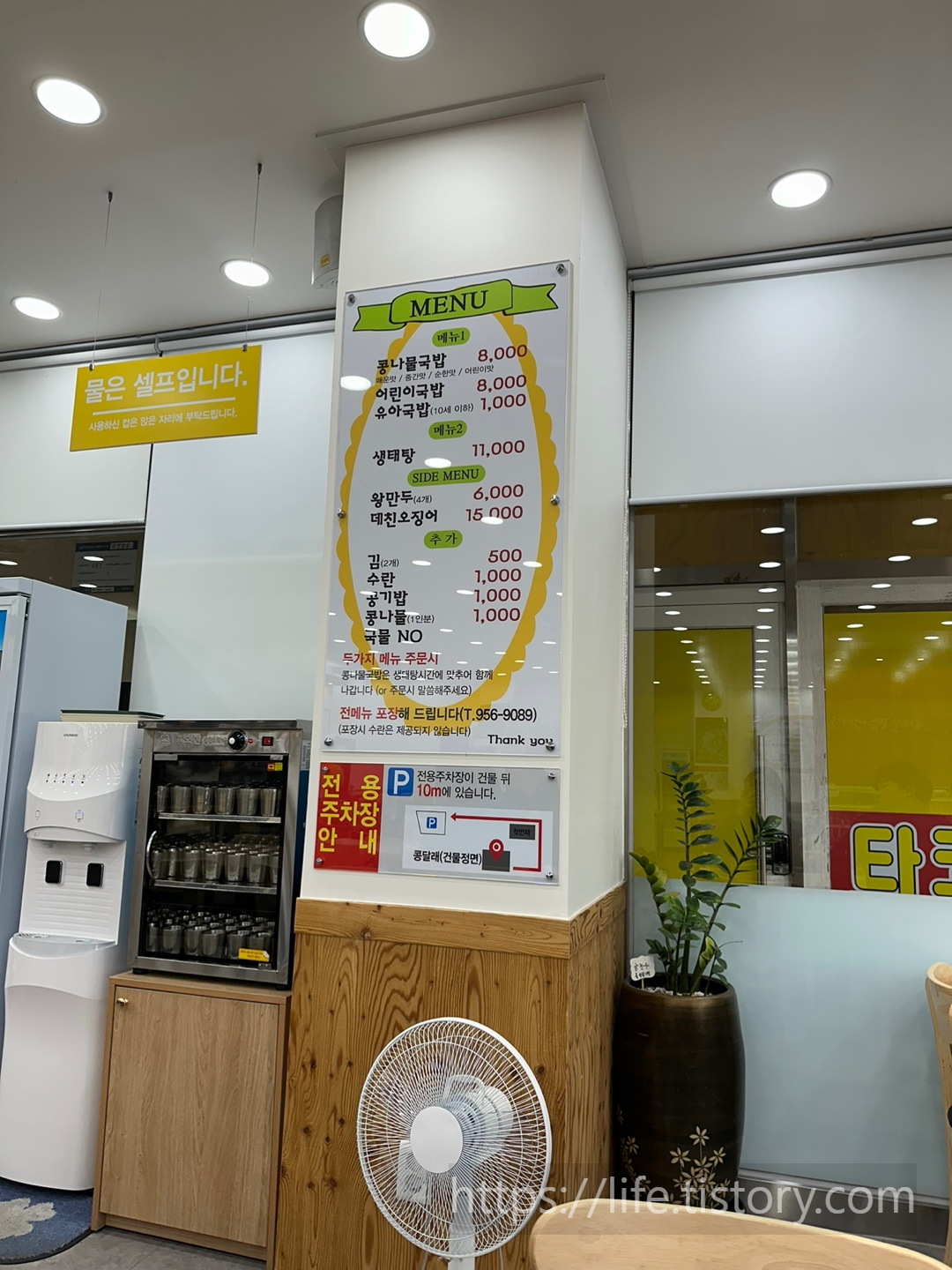 물은 셀프로 뜨고 테이블옆에 휴지와 수저가 들어있다.