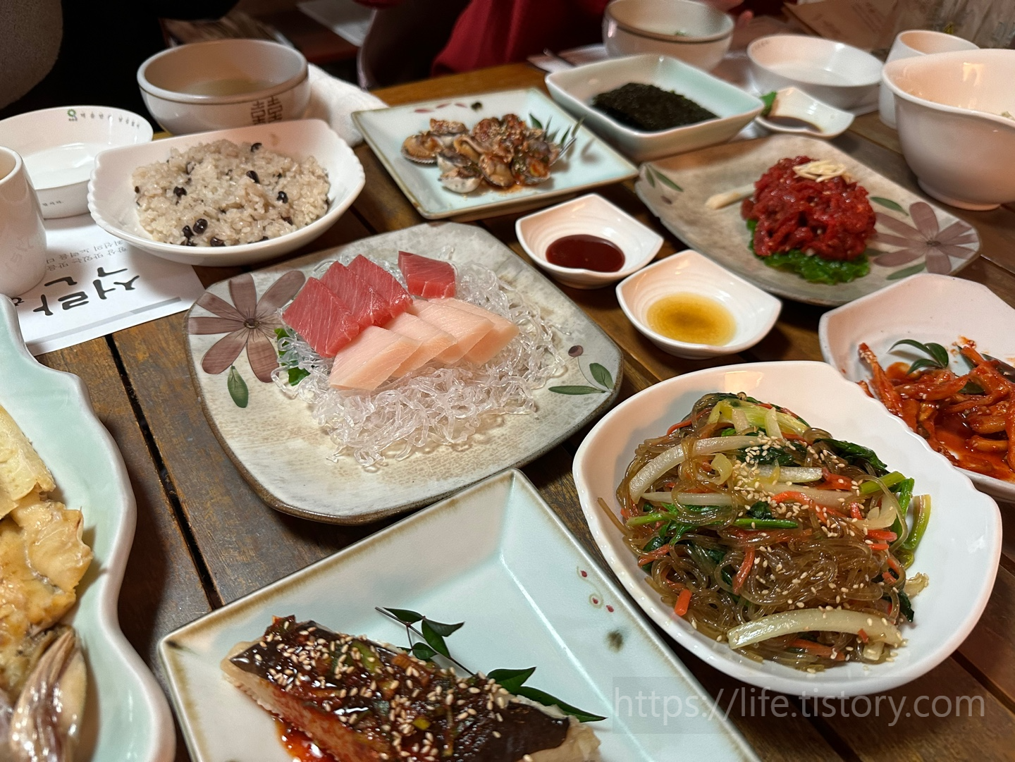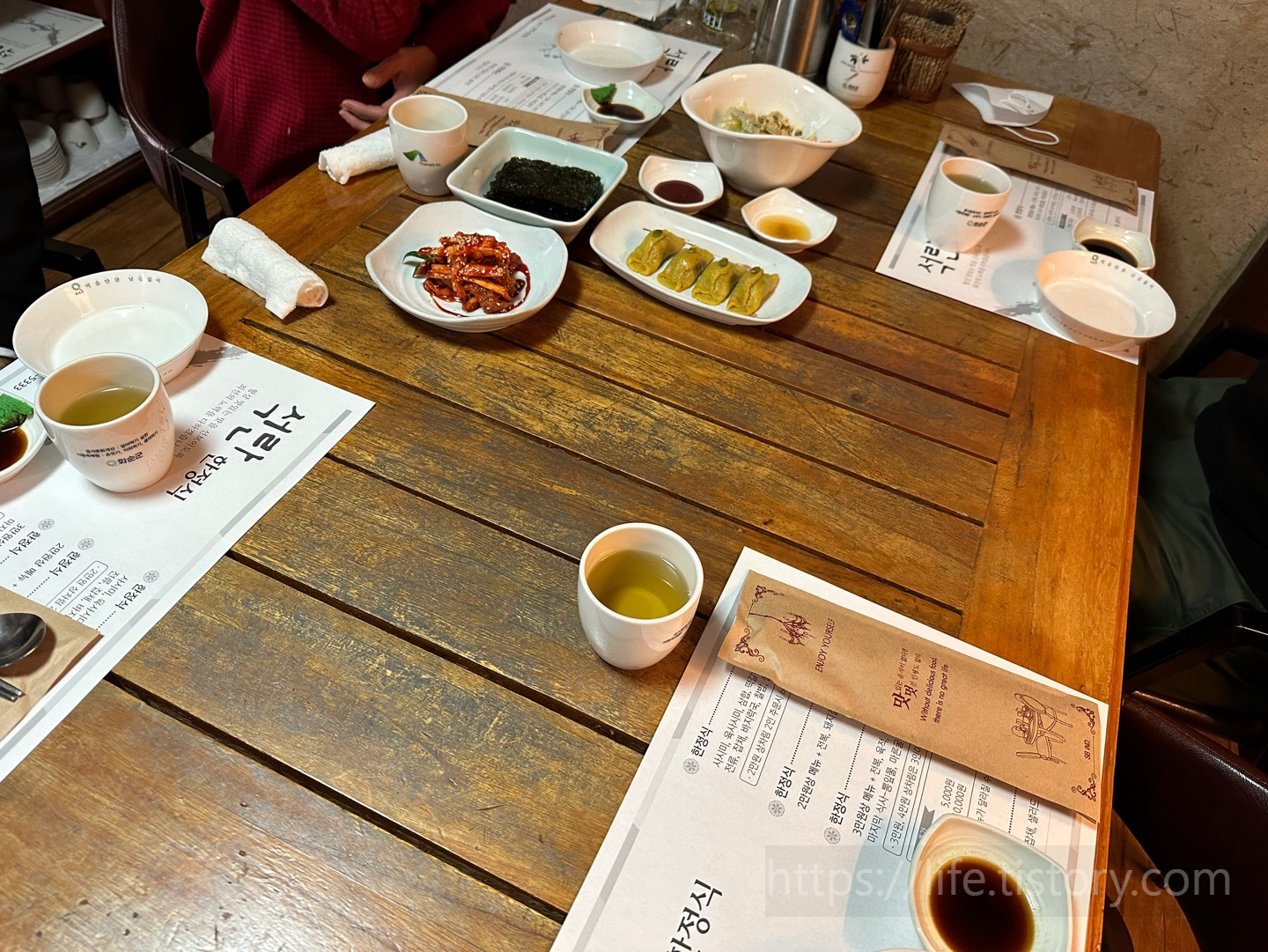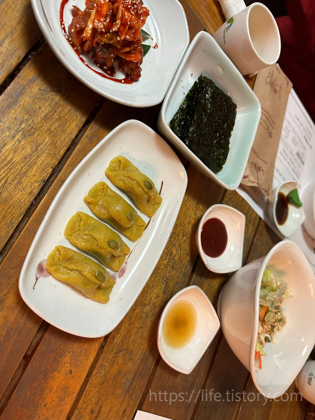 처음 애피타이저들은 떡이라 해야 하나 부꾸미라 해야 하나, 그리고 김, 샐러드, 날이 쌀쌀했는데 따뜻한 물이 나와서 좋았다.