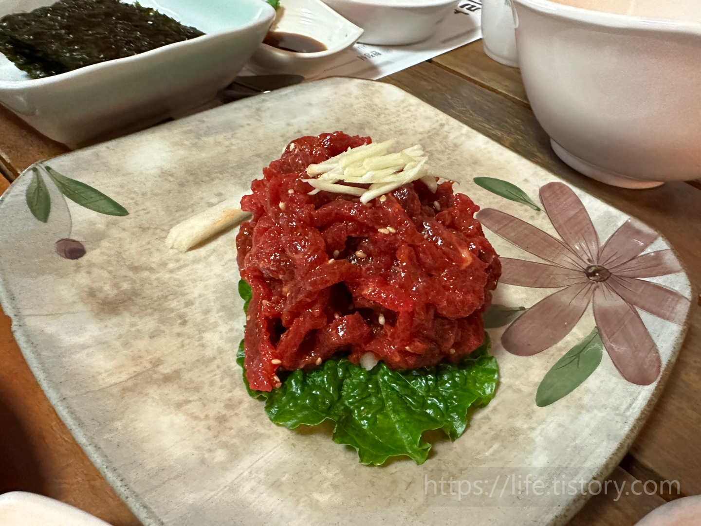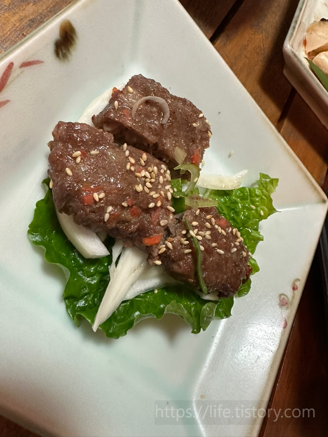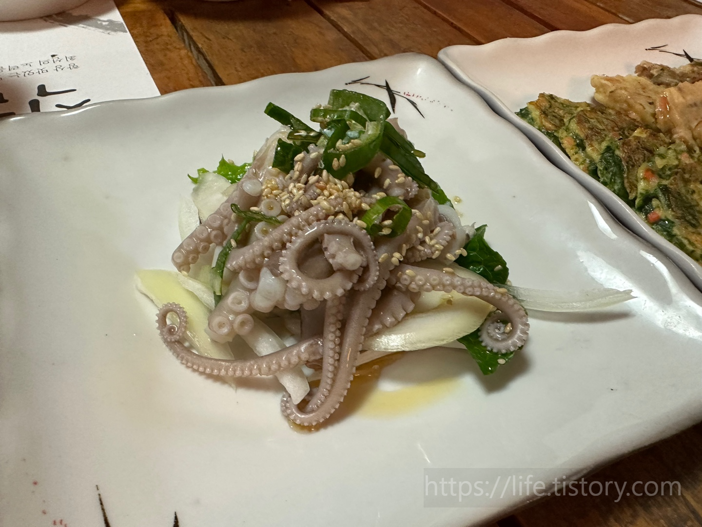 처음 애피타이저들은 떡이라 해야 하나 부꾸미라 해야 하나, 그리고 김, 샐러드, 날이 쌀쌀했는데 따뜻한 물이 나와서 좋았다.