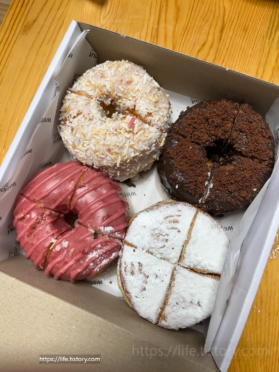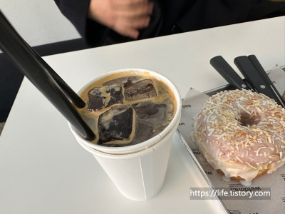 도넛 포장용기와 커피도 따로 팔았는데, 도넛만 포장해서 사가고 커피는 집에 커피 블렌더가 없어서 패스했다.