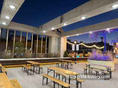 바깥 뷰, 카페 밖으로 테이블이 있어서 겨울 빼고는 앉아서 있기 좋을 것 같다.