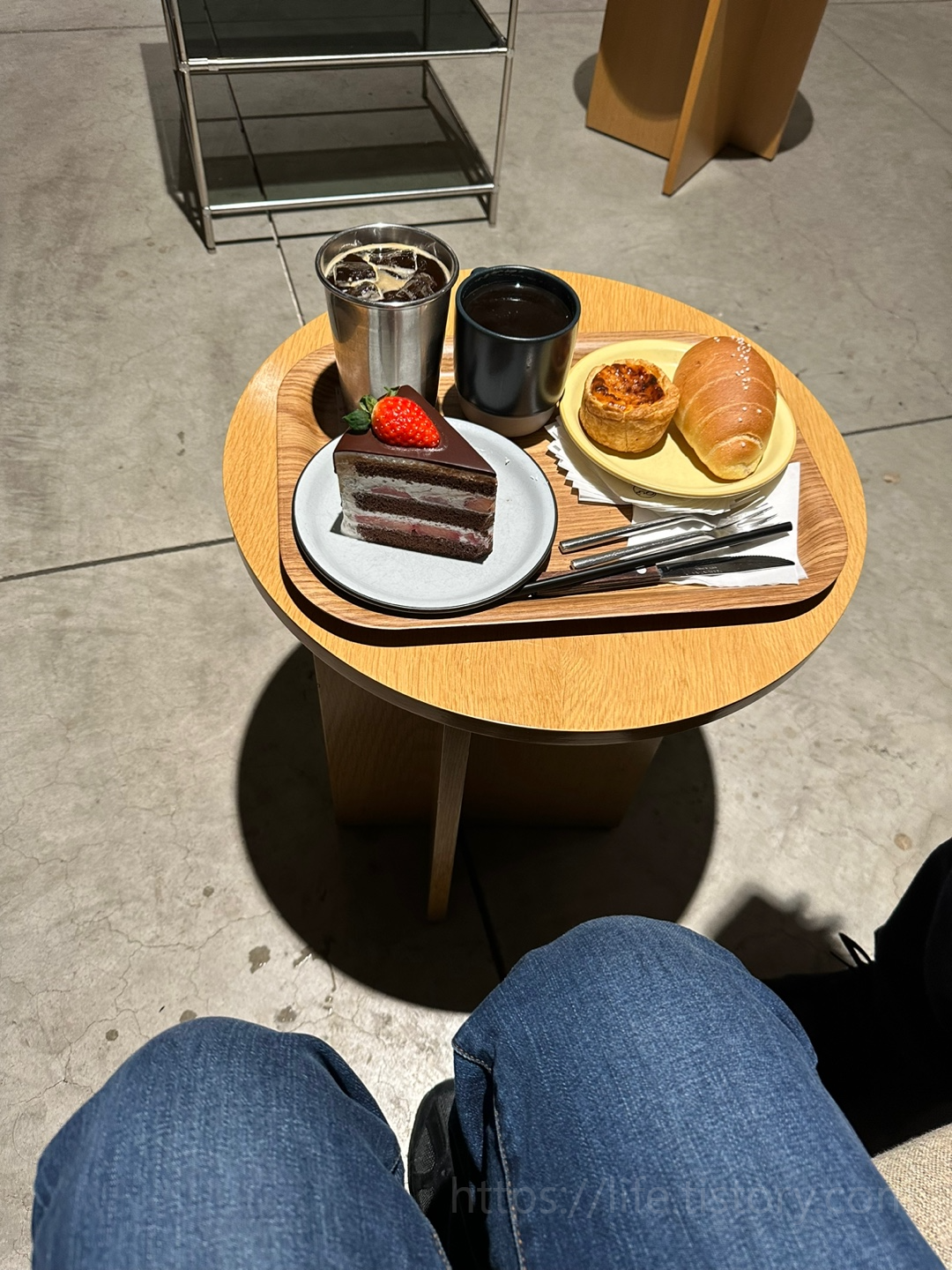 아포카네티라미슈가 없어서 아쉬운 대로 초코 생크림딸기케이크, 역시나 케이크도 소금빵도 에그타르트도 맛있었다.